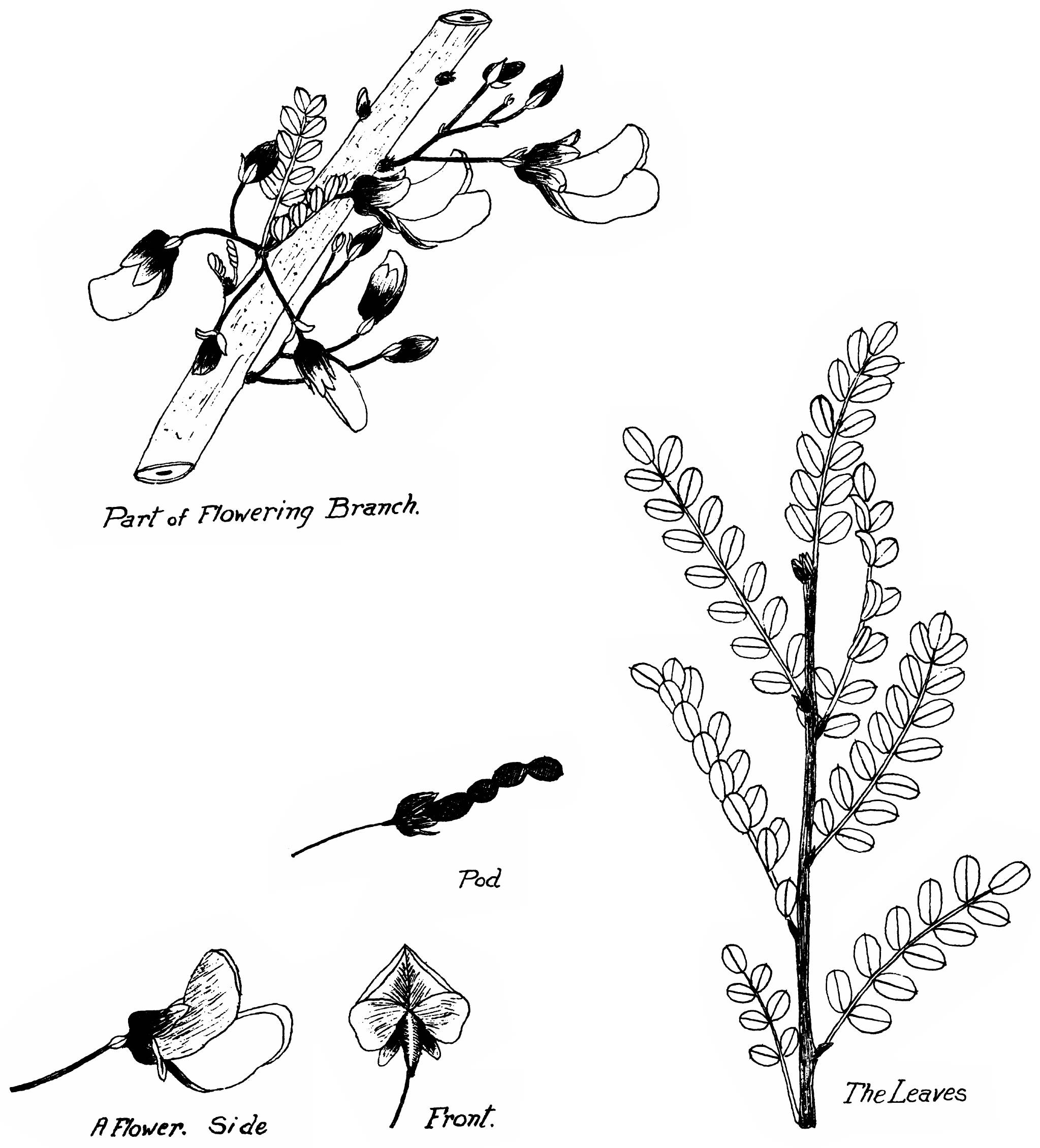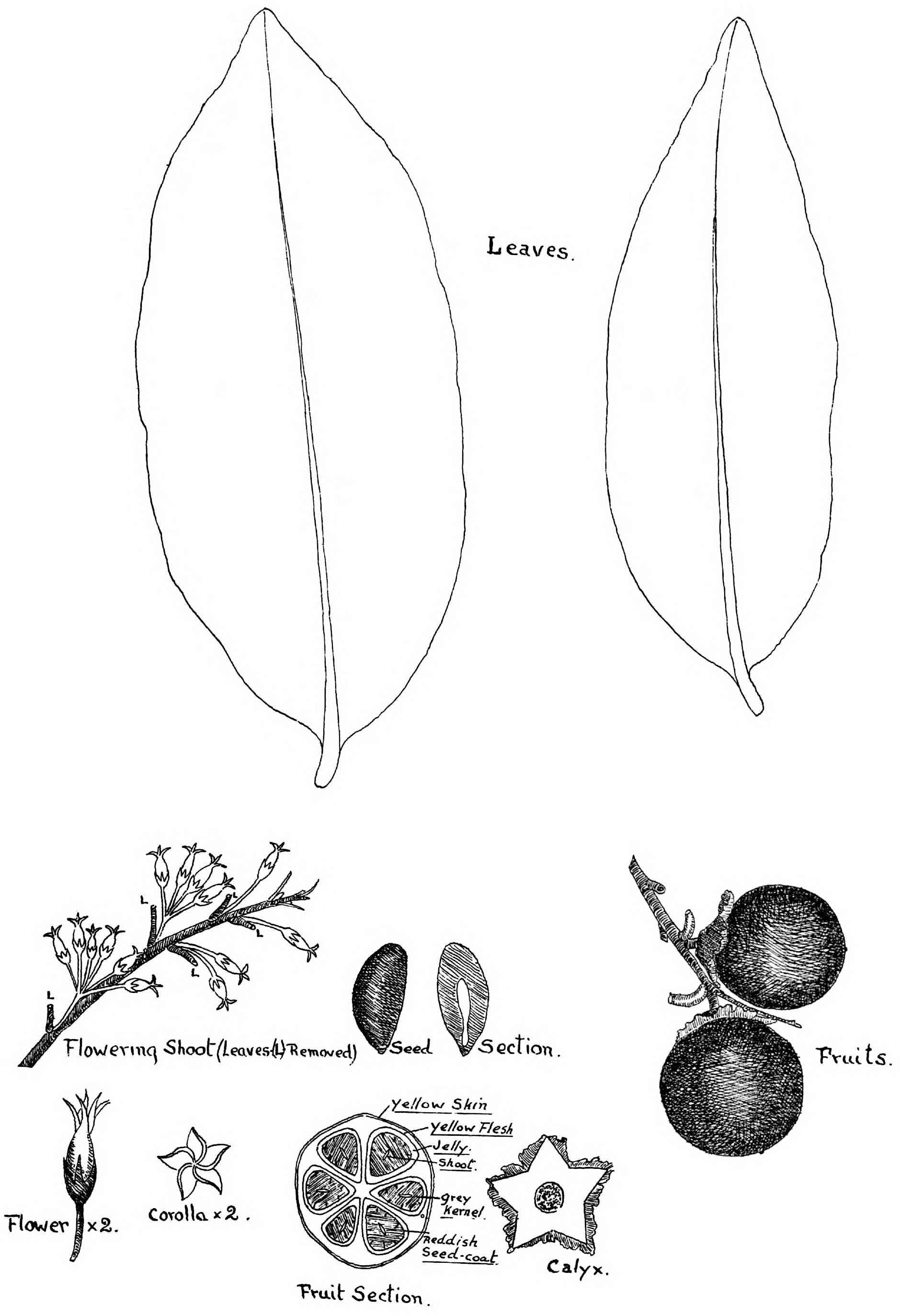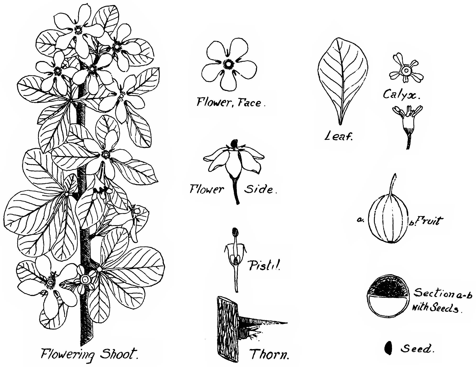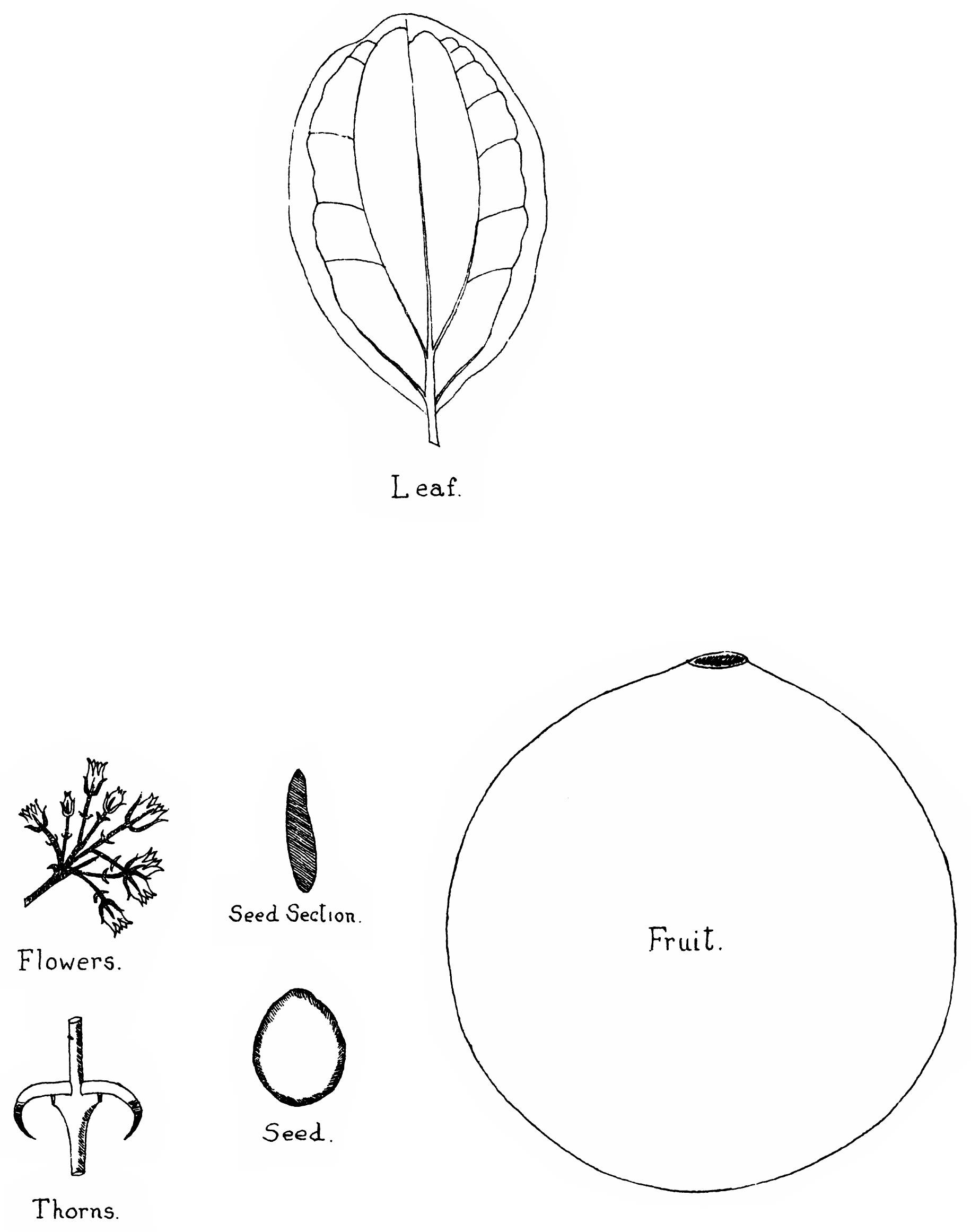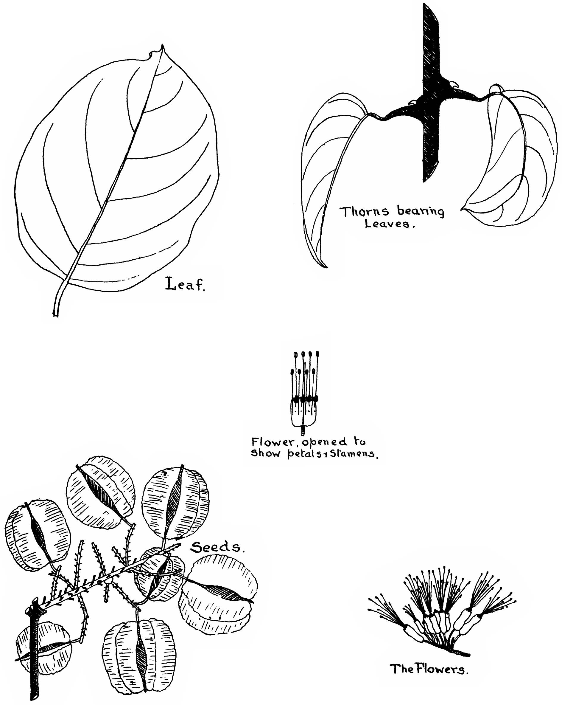 The text is supplemented by drawings of the flower, leaf, thorn, fruit and seed, sketched from the living specimens. Wherever possible the drawings are actual size to avoid calculations from enlarged or reduced figures, but a number have been enlarged to show structures, or reduced owing to their actual size. In several cases sections of various parts have been made to illustrate peculiarities of structure, a pocket lens being used for this purpose, though practically all the parts drawn are visible to the unaided eye.