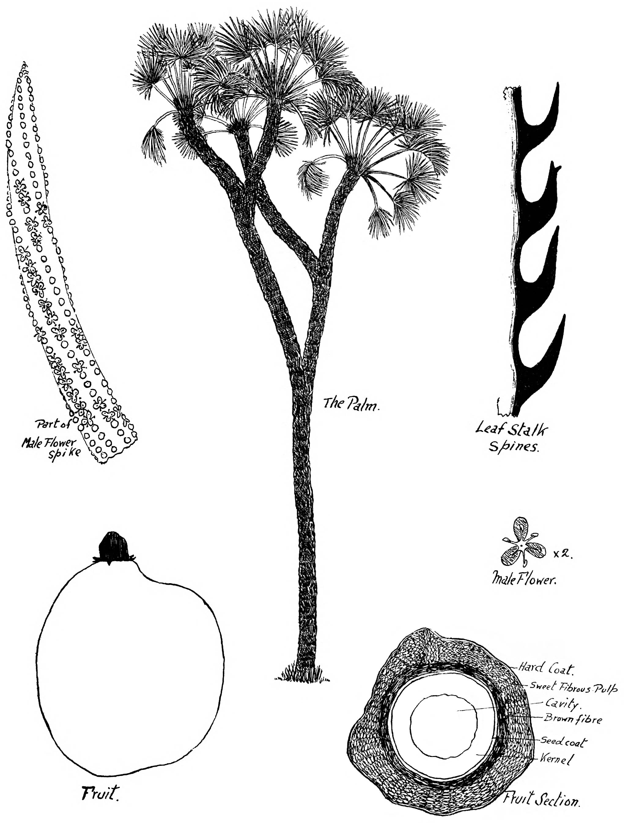 “Fadamma.”—This is represented by the broad river valley perennially inundated, or a depression of varying size in flat country where water lies during the rains. Typical species are Mitragyne africana, Paradaniellia Oliveri and Borassus flabellifer, the Fan Palm. There is either a dense growth of grass or, in the case of temporary lakes, an area of cracked mud.