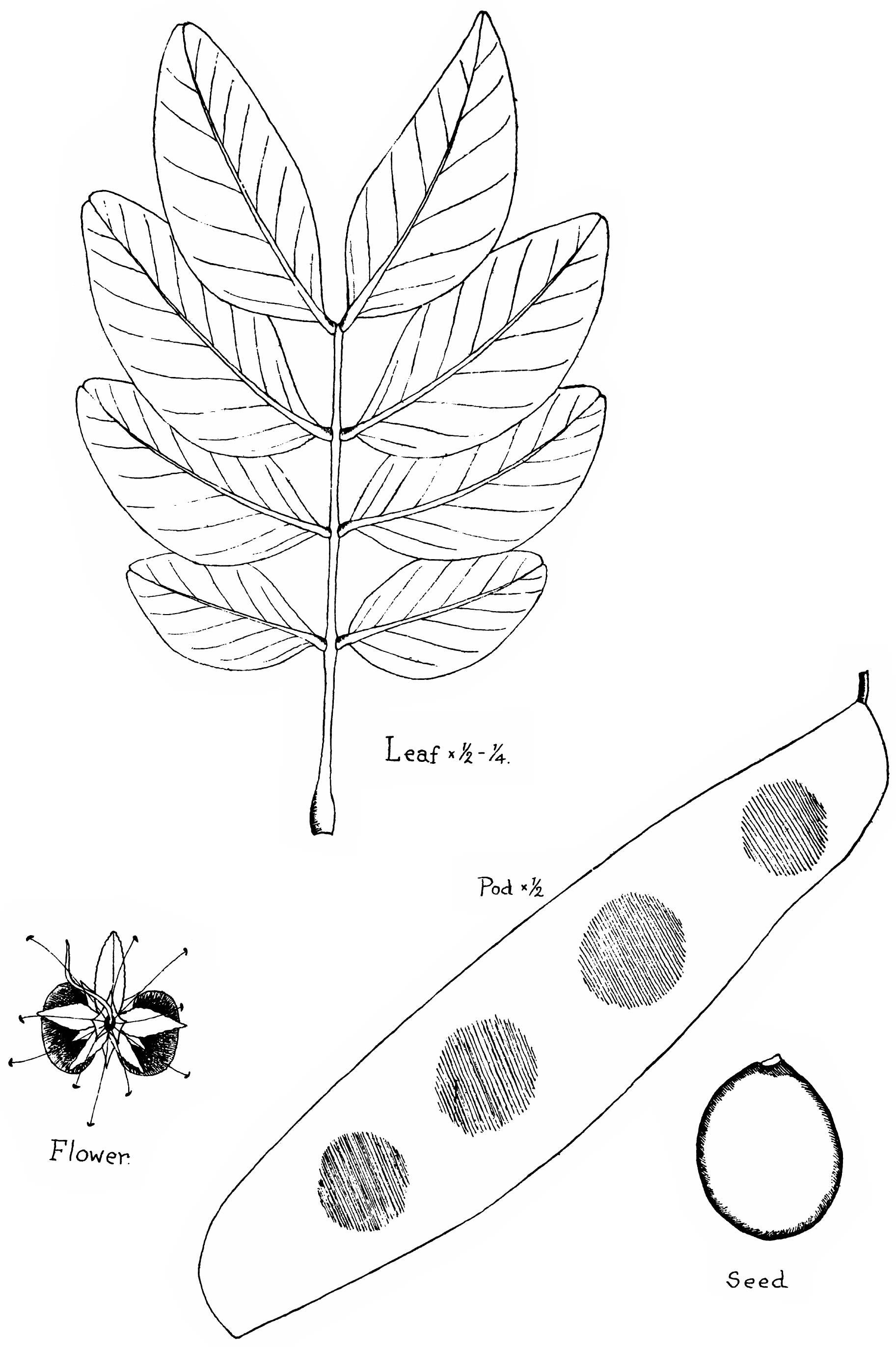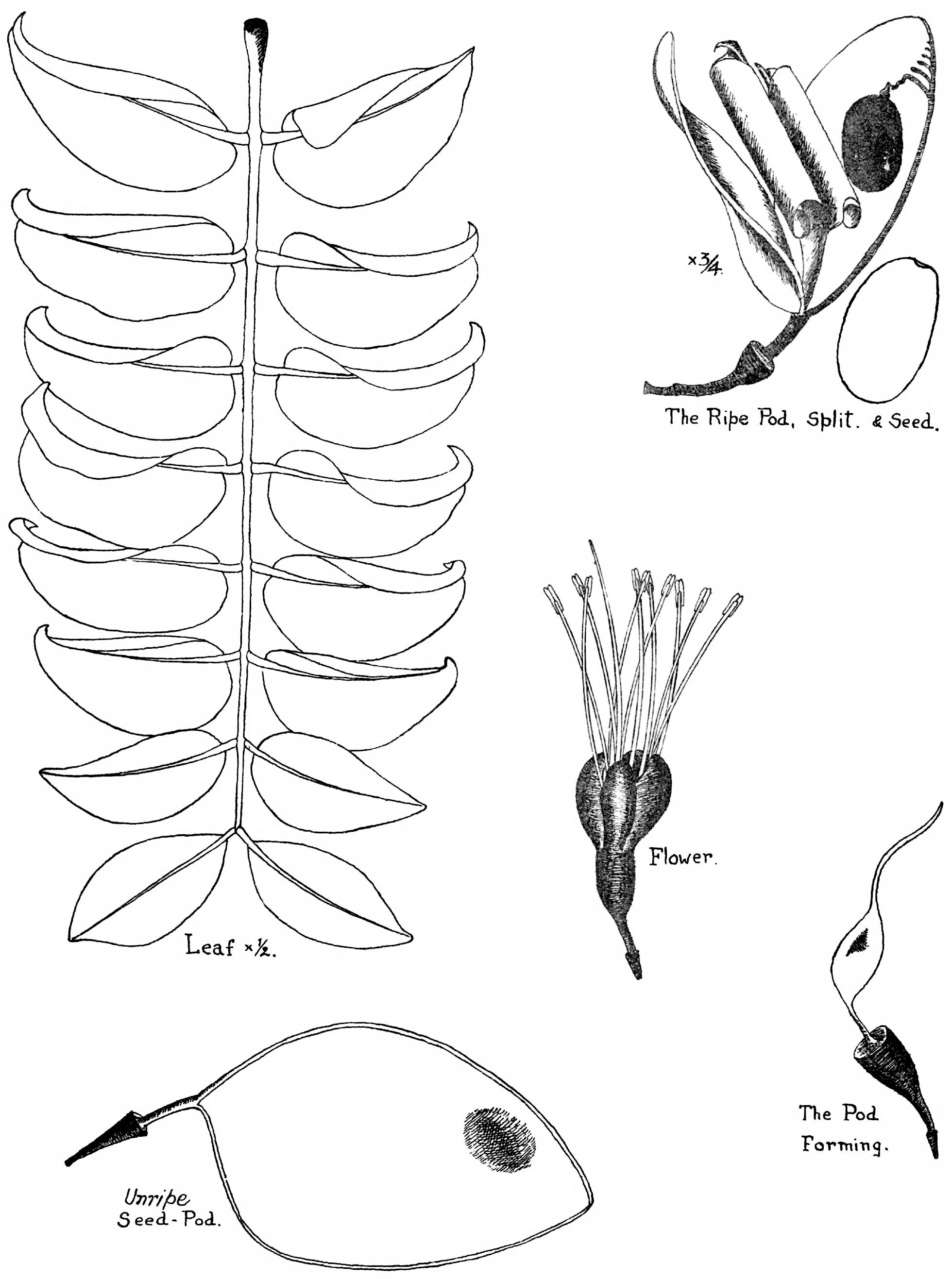 The Fruits are pods, 4-5 inches long, ¾ inch wide, very flat, with the seeds slightly embossed. They are very numerous, tenacious and conspicuous on the trees from October onwards. The seeds, about six in a pod, are round, flat, shiny and dark brown, the same colour as the pods, and have strong germinating power.