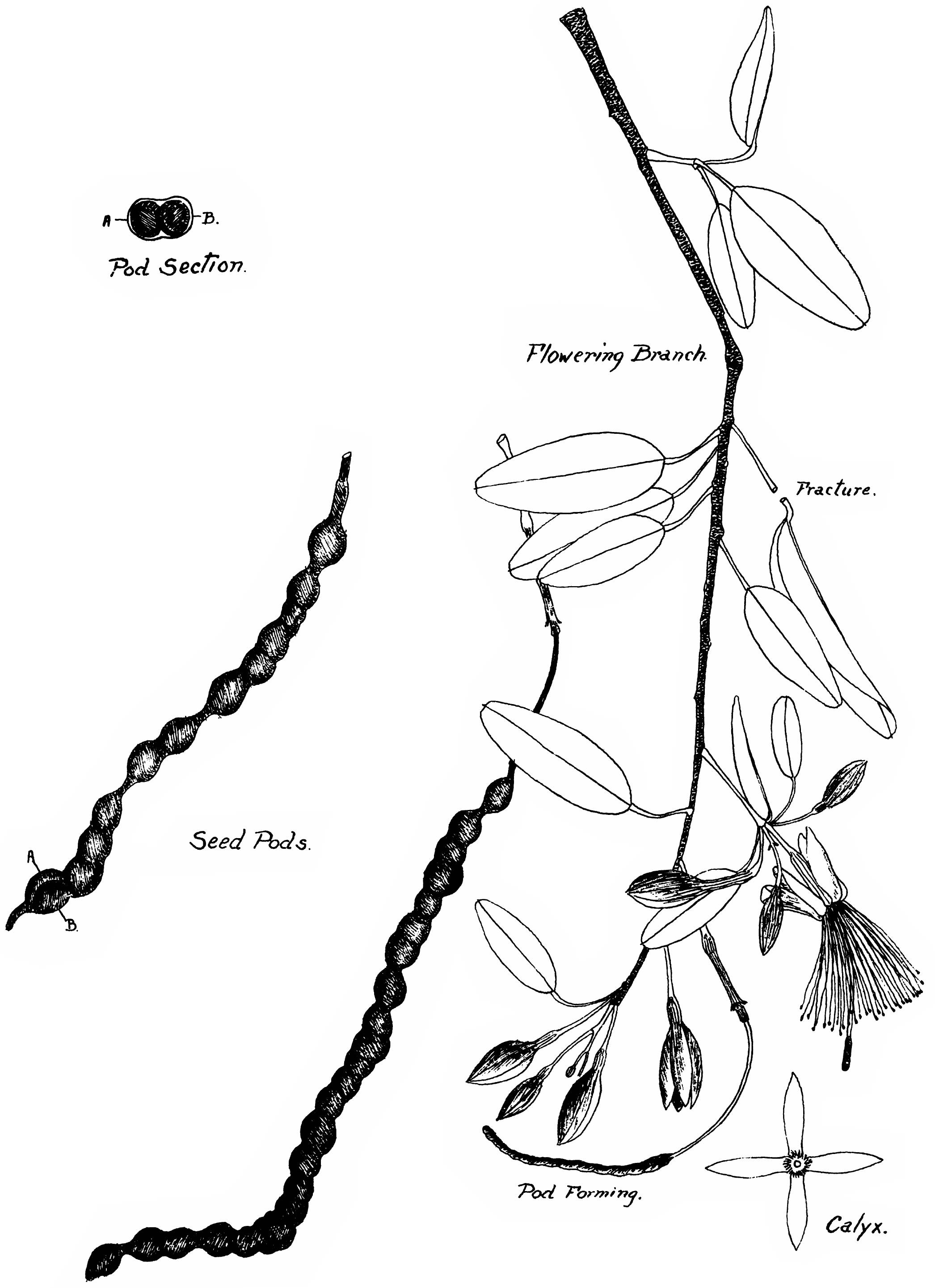 The Fruits are jointed pods, straight or sickle-shaped, with slightly embossed seeds. The pod surface is wrinkled and covered densely with a whitish bloom. The seeds, some 10-12 in a pod, are round, flattened, shiny and brown, ⅜ inch in diameter. The pods, ripening towards the end of the year, fall to the ground entire. They are the “Sant Pods” of commerce.