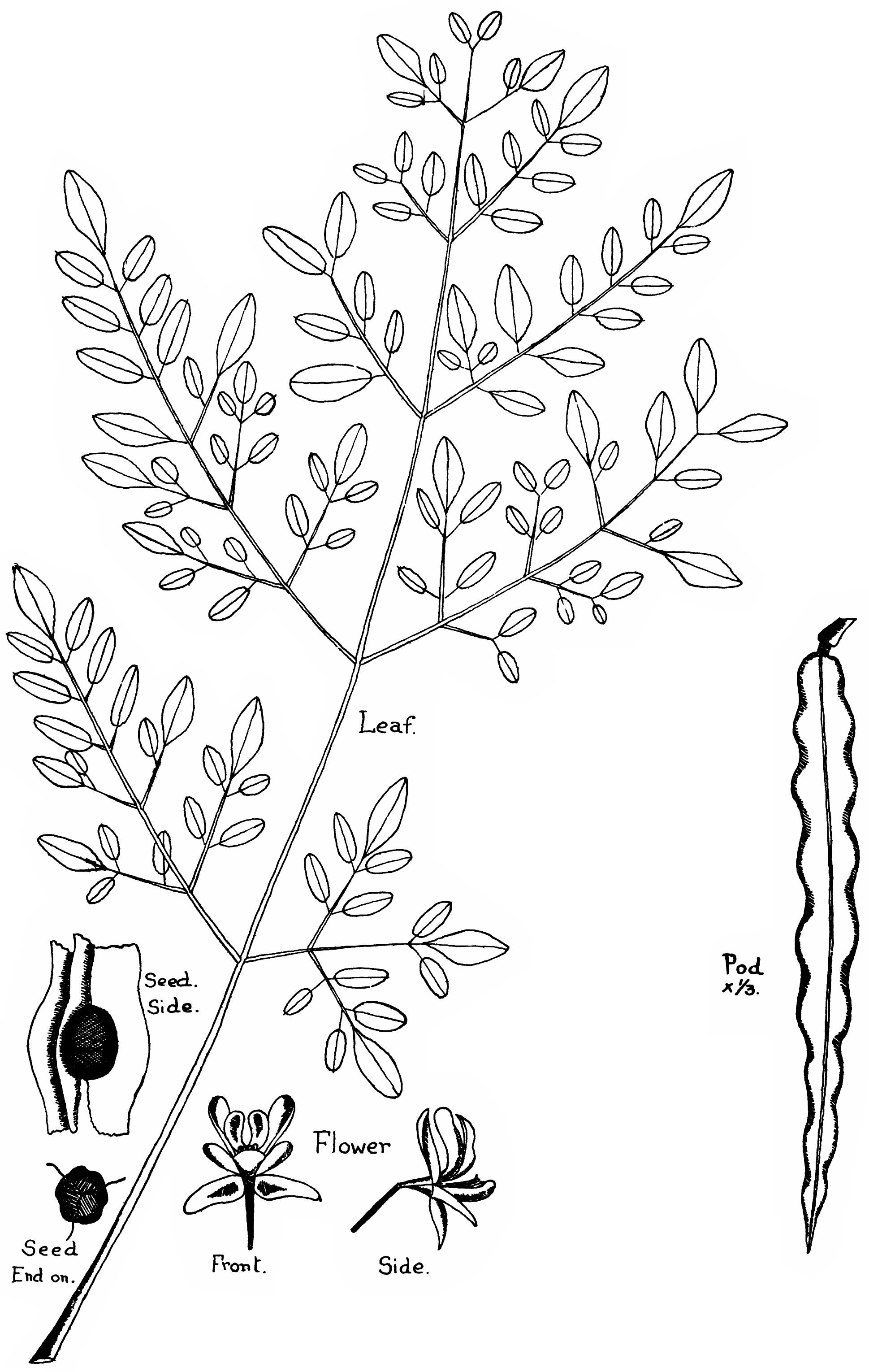 The Leaves are 2-3 inches long with some five pairs of pinnae bearing 10-20 pairs of leaflets, bluish-green with a grey pubescence.