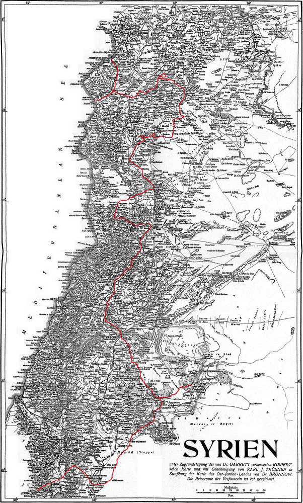 Keins der Länder, die ich besucht habe, ist dem Reisenden jungfräuliches Land, wenn auch manche dieser Gegenden bisher nur selten aufgesucht und nur in teuren und meist schwer erhältlichen Werken beschrieben worden sind. Von solchen Orten habe ich einen kurzen Bericht gegeben und alle die Photographien hinzugefügt, die mir von[S. vii] Interesse zu sein schienen. Bei den Städten Nordsyriens habe ich auch jener historischen Überreste Erwähnung getan, die dem gelegentlichen Beobachter ins Auge fallen. Es gibt in Syrien und am Rande der Wüste noch viel Forscherarbeit zu tun, noch manches schwierige Problem zu lösen. De Vogüé, Wetzstein, Brünnow, Sachau, Dussaud, Puchstein und seine Kollegen, die Glieder der Princetonschen Expedition u. a. m. haben das Werk mit gutem Erfolg begonnen, und auf ihre Schriften verweise ich alle diejenigen, denen daran liegt zu erfahren, wie unermeßlich reich das Land an architektonischen Monumenten und schriftlichen Überresten einer weit zurückliegenden Geschichte ist.