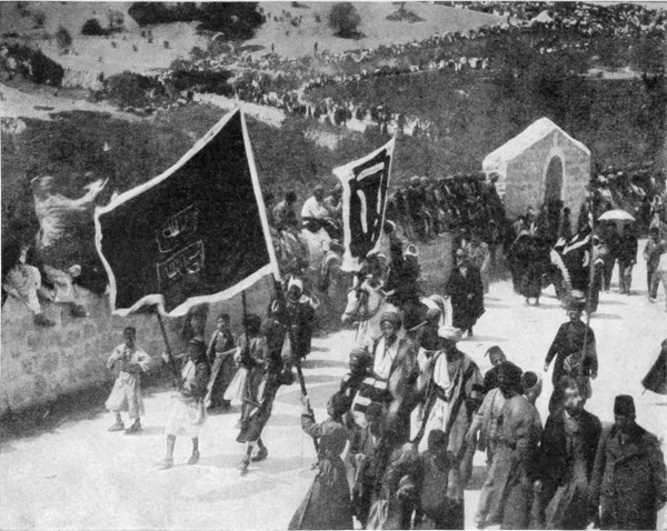 Die Scherarāt im Chor murmelnd: »Gott! Und Mohammed, der Prophet Gottes! Friede sei mit ihm!«