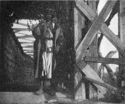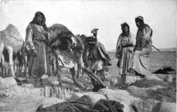 Namrūds Höhle läuft weit in die Erde hinein; sie muß sich bis in die Mitte des Tneibberges erstrecken. Mit Ausnahme der niedrigen Schlafstellen und der Krippen für das Vieh, die in die Wände eingehauen sind, ist der erste Raum augenscheinlich natürlichen Ursprungs. Ein enger, durch die Felsen gebrochener Gang führt in ein kleines Gelaß, hinter welchem noch mehrere andere liegen, die ich aber auf Treu und Glauben hinnahm, da die schwüle, eingeschlossene Luft und die zahllosen Fliegen mich von weiterer Besichtigung abhielten. An diesem Abend bot die Höhle ein so urwüchsiges, wildes Bild, daß selbst der abenteuerlichste Geist davon befriedigt sein mußte. In rote Lederstiefel und gestreifte, regendurchweichte Mäntel gehüllt, saßen zehn bis zwölf Araber in der Mitte um das Reisigfeuer, in dessen Asche die drei Kaffeetöpfe standen, die von der Wüstengastlichkeit untrennbar sind. Hinter ihnen kochte eine Frau Reis über einem helleren Feuer, das flackernde Lichter in die Tiefen der Höhle und auf Namrūds Vieh warf, das, an seinen Felsenkrippen stehend, gemächlich seinen Häcksel zermalmte. Nachdem man mir einen verhältnismäßig sauberen Platz im Kreise eingeräumt und eine Tasse Kaffee gereicht hatte, ging die Unterhaltung weiter, solange als ein Mann seine arabische Pfeife fünfmal rauchen konnte. Sie drehte sich hauptsächlich um die Schandtaten der Regierung. Der Arm des Gesetzes, oder vielmehr die gepanzerte Faust der Ungerechtigkeit ist ein beständig drohender Schrecken am Saum der Wüste. Dieses Jahr war sie, infolge der Anforderungen des Krieges, zu unheimlicher Tätigkeit veranlaßt worden.