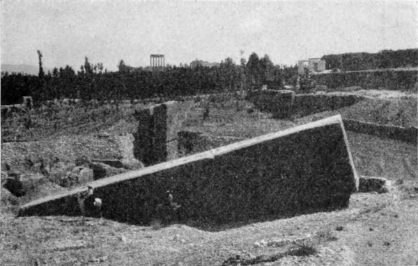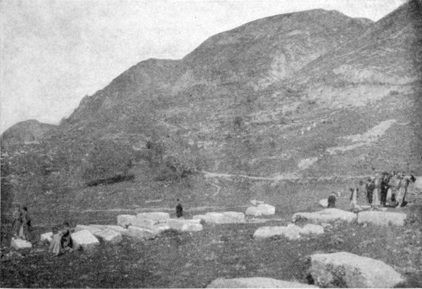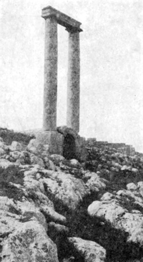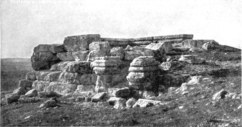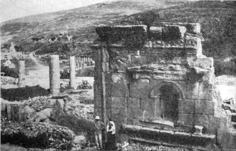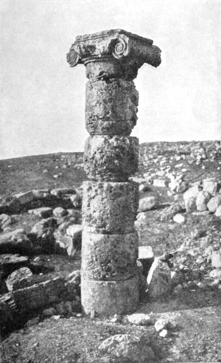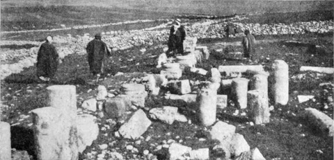 Aus dem tief eingeschnittenen, das Jordantal überragenden Gebirge kamen wir in ein flaches Hügelland, in dem zahlreiche verfallene Plätze liegen. Eine Viertelstunde vor den an der Quelle des Wādi Sīr befindlichen Ruinen stießen wir auf eine ansehnliche Menge Mauerwerk und eine Zisterne, welche die Araber Birket Umm el 'Amūd (Brunnen der Mutter der Säule) nennen. Jūsef berichtete, daß dieser Name von einer Säule herrühre, die früher inmitten des Wassers gestanden; ein Araber schoß nach ihr und zerstörte sie, und nun liegen ihre Trümmer auf dem Grunde der Zisterne. Der Hügel (oder Tell, um ihm dem heimischen Namen zu geben) von Amēreh ist ganz mit Ruinen bedeckt, und weiterhin, in Jadūdeh, findet man Felsengräber und Sarkophage am Rande der Brunnen. Der ganze Saum der Wüste ist mit ähnlichen Zeugen einer vergangenen Bevölkerung übersät; wir finden Dörfer aus dem 5. und 6. Jahrhundert, der Zeit, wo Mādeba eine reiche, blühende Christenstadt war, ja einige entstammen zweifellos einer noch früheren, vielleicht vorrömischen Periode.