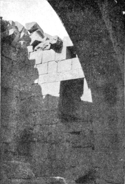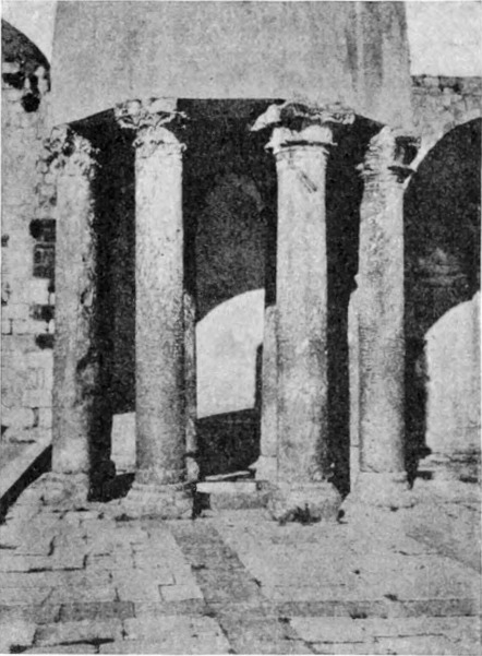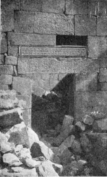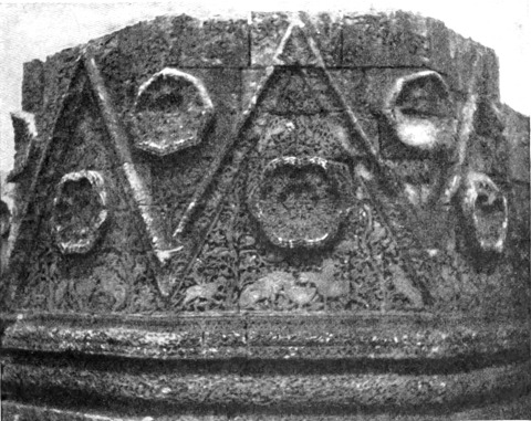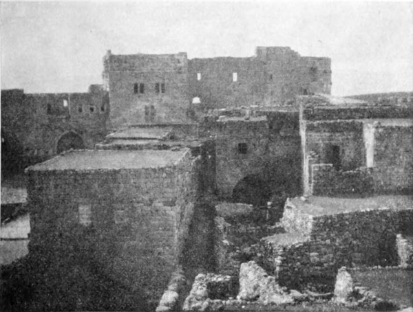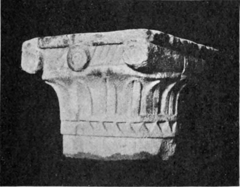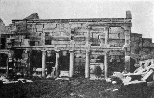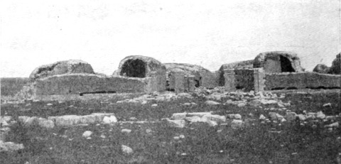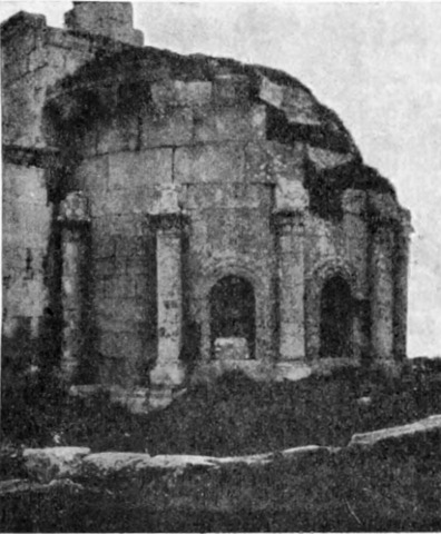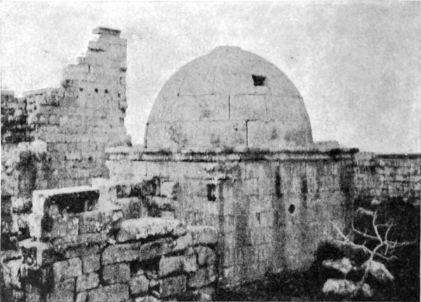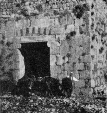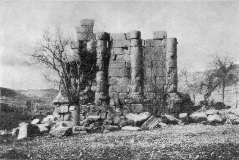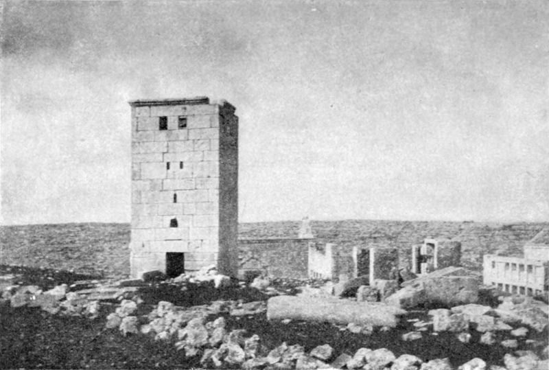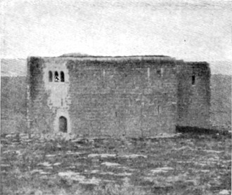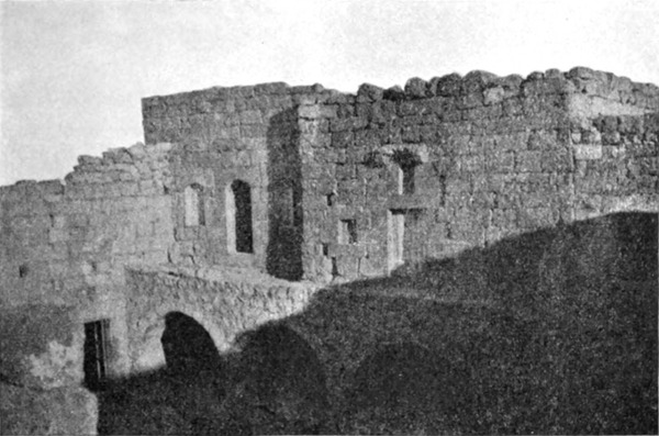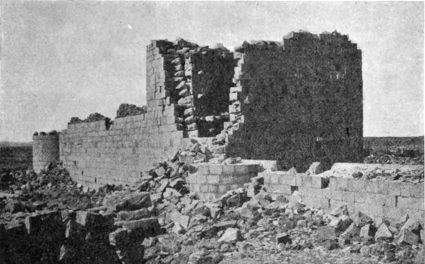 Diese Art Fort war an der Ostgrenze des Kaiserreichs nicht ungewöhnlich und wurde von den Ghassaniden nachgeahmt, als sie sich in der syrischen Wüste niederließen; nimmt man doch an, daß auch Mschitta nur ein besonders schönes Beispiel dieser Art Gebäude war. Kastal hat eine starke Befestigungsmauer, die nur durch ein einziges, nach Osten gehendes Tor und durch runde Bastionen an den Ecken und den Seiten entlang, unterbrochen wird. Im Innern befindet sich eine Reihe parallellaufender gewölbeartiger Räume, die in der Mitte einen Hof freilassen — es ist dies mit kleinen Veränderungen der Plan von Kal'at el Beida in der Safa und von den modernen Karawansereien[1]. Nach Norden zu liegt ein gesondertes Gebäude, wahrscheinlich das Prätorium,[S. 33] die Wohnung des Festungskommandanten. Es besteht aus einem riesigen gewölbten Raum mit einem mauerumgebenen Hof davor und einem runden Turm in der südwestlichen Ecke. Der Turm hat innen eine Wendeltreppe, außen aber einen Fries, der oben Laubwerk und unten gekehlte Triglyphen, dazwischen aber leere Metopen zeigt. Die Maurerarbeit ist ungewöhnlich gut, und die Mauern von bedeutender Stärke; mit solchen Verteidigungswerken selbst an den fernsten Grenzen des Reiches konnten die Römer des Nachts in guter Ruh schlafen.