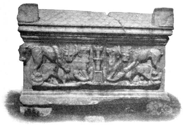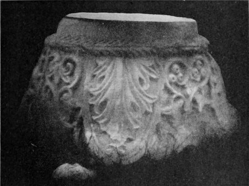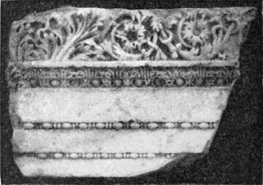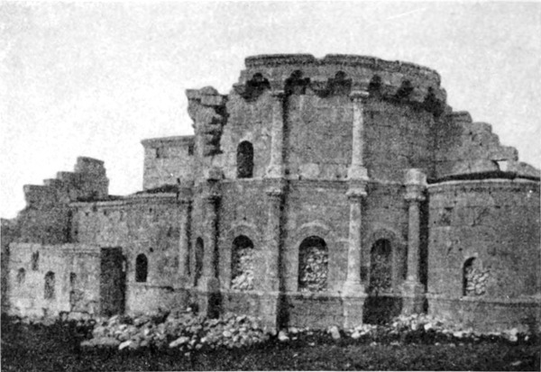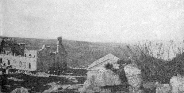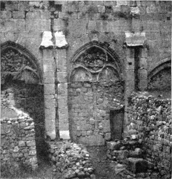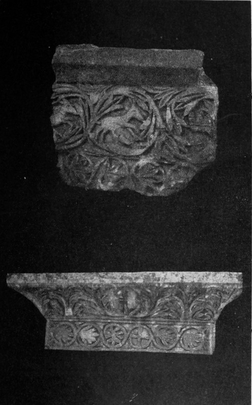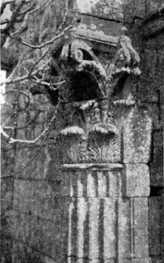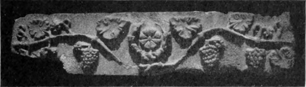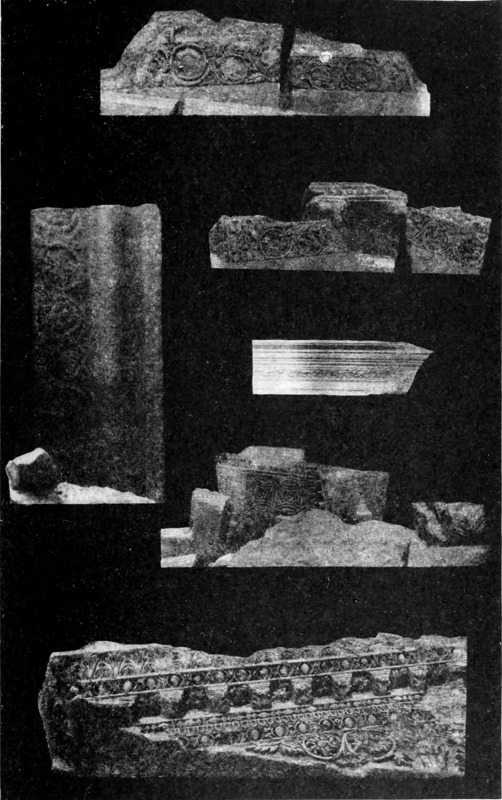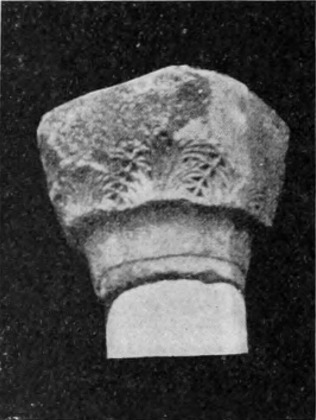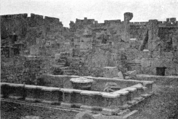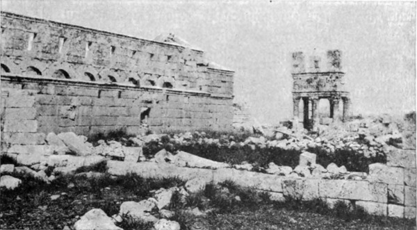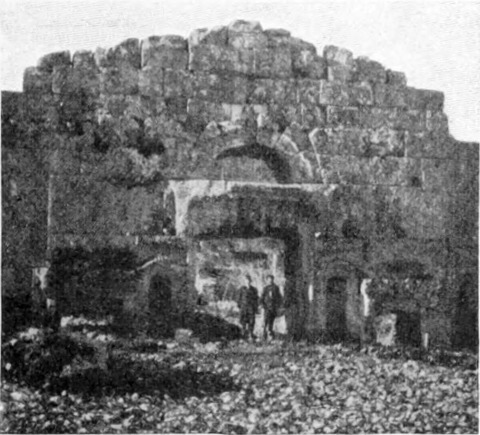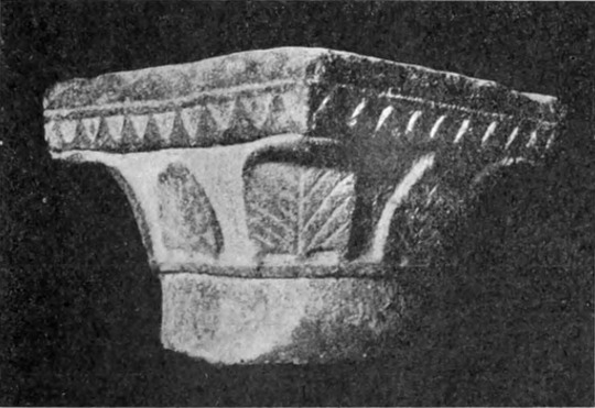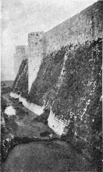 Diese Art Fort war an der Ostgrenze des Kaiserreichs nicht ungewöhnlich und wurde von den Ghassaniden nachgeahmt, als sie sich in der syrischen Wüste niederließen; nimmt man doch an, daß auch Mschitta nur ein besonders schönes Beispiel dieser Art Gebäude war. Kastal hat eine starke Befestigungsmauer, die nur durch ein einziges, nach Osten gehendes Tor und durch runde Bastionen an den Ecken und den Seiten entlang, unterbrochen wird. Im Innern befindet sich eine Reihe parallellaufender gewölbeartiger Räume, die in der Mitte einen Hof freilassen — es ist dies mit kleinen Veränderungen der Plan von Kal'at el Beida in der Safa und von den modernen Karawansereien[1]. Nach Norden zu liegt ein gesondertes Gebäude, wahrscheinlich das Prätorium,[S. 33] die Wohnung des Festungskommandanten. Es besteht aus einem riesigen gewölbten Raum mit einem mauerumgebenen Hof davor und einem runden Turm in der südwestlichen Ecke. Der Turm hat innen eine Wendeltreppe, außen aber einen Fries, der oben Laubwerk und unten gekehlte Triglyphen, dazwischen aber leere Metopen zeigt. Die Maurerarbeit ist ungewöhnlich gut, und die Mauern von bedeutender Stärke; mit solchen Verteidigungswerken selbst an den fernsten Grenzen des Reiches konnten die Römer des Nachts in guter Ruh schlafen.