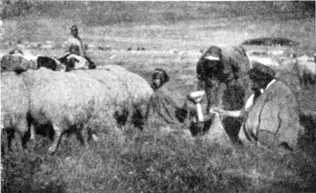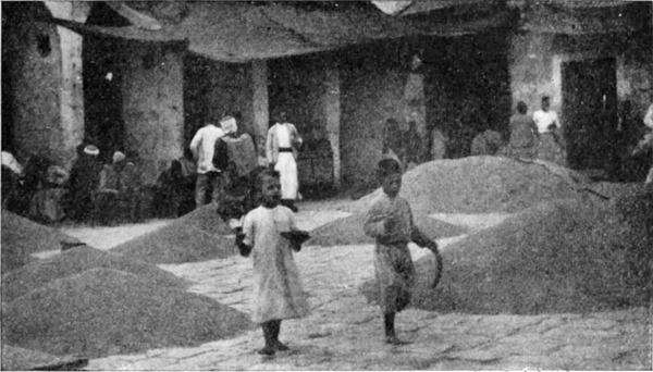 Das Korn wurde in einem tiefen, trocknen Felsenloch aufbewahrt und, goldenem Wasser gleich, eimerweise heraufgezogen. Es war zur besseren Konservierung in Spreu aufbewahrt worden und mußte nun zuvörderst am Brunnenrande gesiebt werden, eine Arbeit, die nicht ohne viel und ärgerliches Geschrei vor sich ging. Nicht einmal die Kamele waren ruhig, sondern mischten sich mit Grunzen und Blöken in den Streit, als die Araber sie mit den vollen Säcken beluden. Die Scheichs der Suchūr und der Scherarāt saßen in dem feinen Sprühregen ringsum auf Steinen und murmelten bisweilen: »Gott! Gott!« Dann riefen sie wieder: »Er ist gnädig und barmherzig!« Nicht selten wurde auch das reine Korn wieder unter das ungesiebte geschüttet; dann pflegte sich ungefähr folgende Szene zu entspinnen: