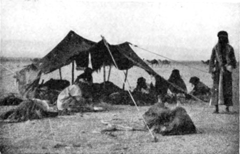 Der Meskin empfing mich mit der Würde eines Fürsten und geleitete mich an den Ehrenplatz auf dem zerlumpten Teppich zwischen dem viereckigen als Feuerstelle dienenden Loch im Fußboden und der Scheidewand, die das Frauengelaß von dem der Männer trennt. Wir hatten unsre Pferde an die langen Zelttaue gebunden, die dem schwachen Gebäude eine so wunderbare Festigkeit verleihen, und unsre Augen schweiften von unserm Sitzplatz aus nach Osten hin über die Landschaft — Wellenberg und Wellental — sie hob und senkte sich, als atme die Wüste leise und ruhig in der hereinbrechenden Nacht. Die dem Winde abgekehrte Seite eines Araberzeltes ist stets offen; dreht sich der Wind, so nehmen die Weiber die Zeltwand ab und drehen es nach einer anderen Himmelsrichtung; in einem Augenblick ist die Lage verändert, und die Wohnung blickt nach der günstigsten Seite hin. Das Häuschen der Araber ist so klein und leicht, und doch so fest verankert, daß der Sturm ihm wenig anhaben kann. Das grobe Gewebe aus Ziegenhaar quillt in der Feuchtigkeit auf und filzt so zusammen, daß nur fortgesetzter, vom Sturm heftig gepeitschter Regen in die Wohnstätte eindringen kann.