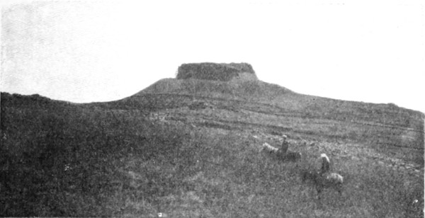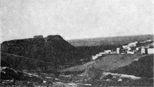 In Jadūdeh hat ein Christ aus Salt, der größte Kornproduzent der Gegend, seinen Wohnsitz aufgeschlagen; er bewohnt ein einfaches Landhaus auf der Spitze des Hügels. Man rechnet ihn zu den energischen Bahnbrechern, die bemüht sind, die Grenzen der Kultur immer weiter hinauszuschieben. Bei Jadūdeh verließen wir das Hügelland und betraten die endlose, mit spärlichem Grün bewachsene Ebene. Hie und da ein kegeliger Hügel oder ein niedriger Höhenzug, dann wieder weite, unbegrenzte Ebene. Ruhevoll dem Auge und doch nie monoton liegt sie, in die magische Glut des winterlichen Sonnenuntergangs getaucht; auf den sanft gewölbten Erhöhungen rastet noch das Licht, die leichten Bodensenkungen bergen schon die Schatten der Nacht, und über dem allen breitet sich der weite Himmelsdom aus, der Wüste und[S. 25] Meer gleichermaßen überwölbt. Die erste größere Erhebung ist der Tneib. Wir erreichten ihn nach einem neunstündigen Marsch um ½6 Uhr, gerade als die Sonne sank, und schlugen unsere Zelte an der südlichen Berglehne auf. Der ganze Abhang war voller Ruinen: niedrige Mauern aus rohbehauenen Steinen ohne Mörtel, in Felsen gehauene Zisternen, deren einige ursprünglich jedenfalls weniger zu Wasser- als zu Kornbehältern benutzt worden, welchem Zweck sie auch jetzt noch dienen. Namrūd war zum Besuch eines benachbarten Landwirtes geritten, einer seiner Männer aber eilte sofort, ihn von meiner Ankunft zu benachrichtigen, und gegen 10 Uhr abends erschien er im Glanze der frostblitzenden Sterne mit vielen Freudenbezeigungen und der Versicherung, daß meine Wünsche leicht zu erfüllen seien. So legte ich mich zur Ruhe, eingehüllt in das kalte Schweigen der Wüste, und erwachte am andern Morgen zu einem Tage voll Sonnenschein und guter Aussichten.