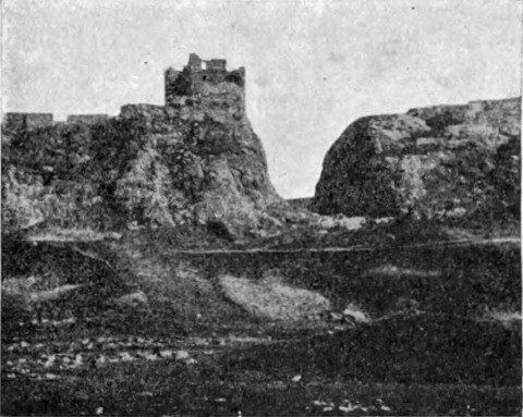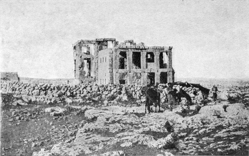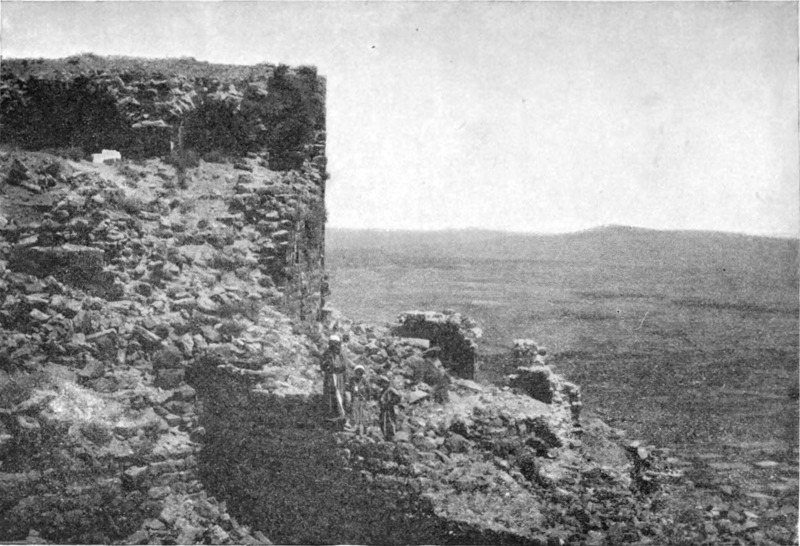 Der folgende Tag versprach ebensowenig, wie sein Vorgänger. Die Maultiertreiber zeigten sich nicht geneigt, die schützenden Höhen zu verlassen und ihre Tiere einem solchen Regen in der offnen Wüste auszusetzen; widerwillig nur schob ich die Reise auf und schickte die Männer nach dem drei Stunden entfernten Mādeba nach Hafer für die Pferde, schärfte ihnen aber ein, nicht zu verraten, wer sie geschickt. Am Nachmittag klärte es sich etwas auf, und ich ritt in südlicher Richtung durch die Wüste nach Kastal, einem auf einer Erhöhung liegenden, befestigten römischen Lager.