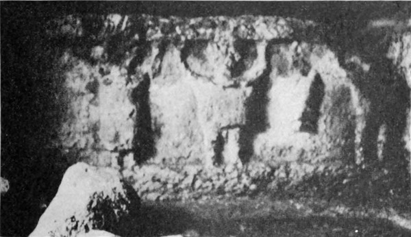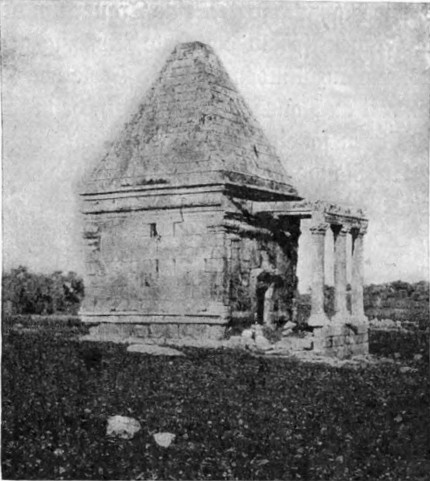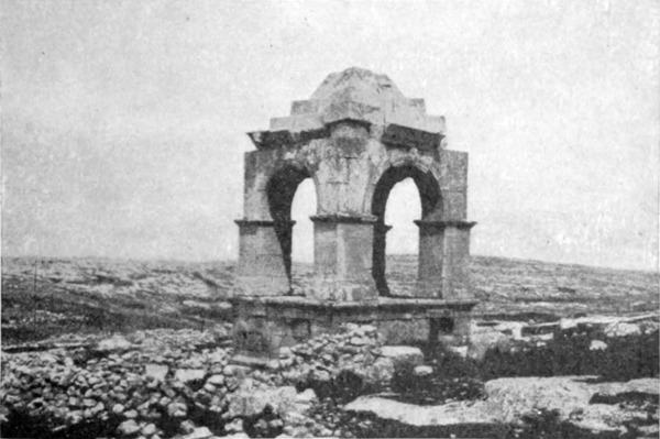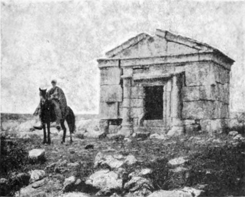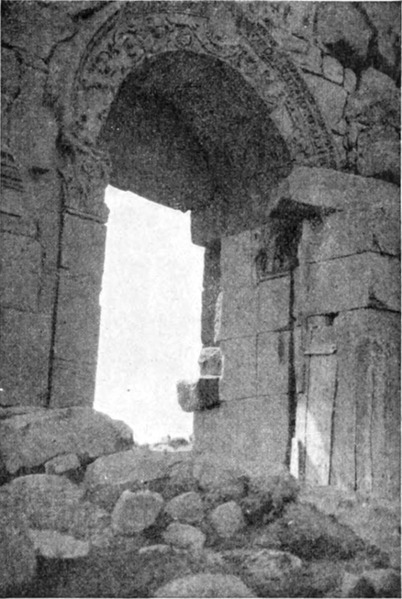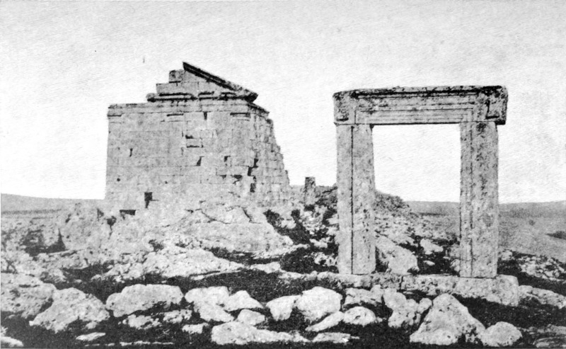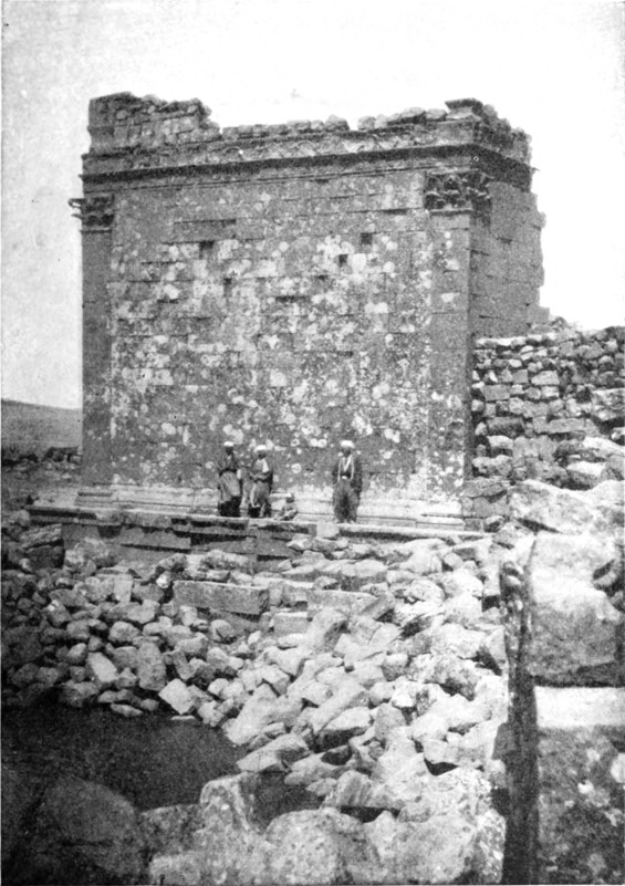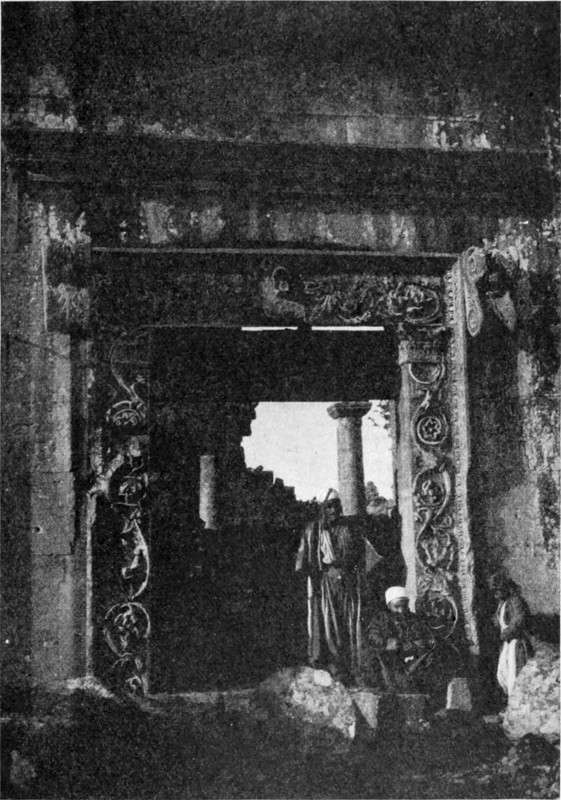 Zunächst mußte nun zu den Arabern geschickt werden. Nach einer Beratung entschieden wir uns für die Da'dja, einen Stamm der Belkaaraber, als für die nächsten und wahrscheinlich geeignetsten, und ein Bote wurde in ihr Lager entsandt. Wir verbrachten den Morgen mit Besichtigung der Ruinen und Betrachtung einer Menge Kupfermünzen, die Namrūds Pflugschar zu Tage gefördert. Lauter römische; eine[S. 26] zeigte undeutlich die Züge Konstantins, andre waren älter, keine entstammte der jüngeren byzantinischen Periode oder der Zeit der Kreuzzüge. Soweit die Münzfunde Zeugnis ablegen können, liegt Tneib seit dem Eindringen der Araber verödet. Namrūd hat die Totenstadt entdeckt, die Gräber aber leer gefunden; wahrscheinlich wurden sie schon vor Jahrhunderten ausgeplündert. Sie waren zisternenartig und in die Felsen gehauen. Zwischen zwei massigen Steinsäulen ein schmaler Eingang dicht über dem Erdboden, einige wenige Vorsprünge zum Hinabsteigen in den Seitenwänden, im unteren Raume Nischen, die in übereinander liegenden Reihen rund um die Mauern liefen. Fast am Fuße des Südabhanges sahen wir die Grundmauern eines Gebäudes, das eine Kirche gewesen sein mochte. Aber das alles war nur ein zu armseliges Ergebnis für die Forschung eines ganzen Tages; wir machten deshalb am goldenen Nachmittag einen zweistündigen Ritt nordwärts in ein breites, zwischen niederen Hängen liegendes Tal. Um den ganzen Rand desselben lagen in Zwischenräumen Ruinen, und nach Osten zu standen verfallene Mauern auch in der Mitte des Tales, — Namrūd nannte die Stelle Kuseir es Sahl, die kleine Wüstenburg. Unser Ziel aber war eine kleine Gruppe von Gebirgen am Westende, Chureibet es Suk. Zunächst kamen wir an ein kleines, halb im Sand begrabenes Bauwerk (41 Fuß zu 39 Fuß 8 Zoll, größte Ausdehnung von Ost nach West). Zwei Sarkophage zeigten an, daß es ein Mausoleum gewesen. In der Westwand war ein bogengeschmücktes Tor; den Pfeilerbogen krönte ein flaches Gesims. In der Höhe des Bogens verschmälerten sich die Mauern um einen kleinen Vorsprung, und etwas höher lief eine geschweifte Kranzleiste. Ein paar Hundert Meter westwärts von dem Kasr oder der Burg (die Araber benennen die meisten Ruinen Burg oder Kloster) liegt ein zerfallener Tempel, der augenscheinlich in irgend einer Zeit einem anderen Zwecke gedient hat, als dem ihm von der Natur zukommenden, denn er zeigte eingestürzte Mauern um die beiden Reihen von je sieben Säulen und unerklärliche Querwände an der westlichen Seite des Säulenganges. Dahinter schien ein doppelter Hof gelegen zu haben, und noch weiter nach Westen hin befand sich ein ganzer Komplex von zerfallenem Mauerwerk. Das Tor sah nach Osten hin, seine Pfeiler zeigten feine Steinmeißelungen: ein Band, eine Palmette, ein zweites glattes Band, eine Weinranke, eine Haspel und Weife, einen Pfeil und eine zweite Palmette auf der oberen Leiste. Das Ganze ähnelte außerordentlich den Kunstwerken in Palmyra — es konnte kaum den Vergleich aushalten mit dem Steinbildwerk[S. 27] in Mahitta, war überhaupt nüchterner und den klassischen Mustern näher verwandt als jene Architektur. Nördlich vom Tempel stand auf einer kleinen Reihenerhebung noch eine Ruine, ein zweites Mausoleum. Es war ein längliches Rechteck aus großen, sorgsam ohne Mörtel gefügten Steinen. An der südöstlichen Ecke führte eine Treppe in eine Art Vorzimmer, das dank dem abfallenden Abhang in gleicher Höhe mit der Ostseite lag. An der Außenwand dieses Vorraums standen Säulenstümpfe, vermutlich die Überreste eines schmalen Säulenganges, der die Ostfassade geschmückt. Sechs Sarkophage standen längs der noch vorhandenen Mauern, je zwei an der Nord-, Süd- und Westwand. Über der Basis der zu beiden Seiten der Treppe befindlichen Säulen lief ein Fries, der einen kühnen Torus zwischen beiden Wänden aufwies, und dasselbe Motiv wiederholte sich auf der Innenseite der Sarkophage. Die Stützmauer auf der Südseite zeigte zwei Vorsprünge, im übrigen war das Gebäude ganz einfach, nur einige der umherliegenden Fragmente schmückte ein lockeres Weinrankenmuster. Dieses Mausoleum erinnert an das Pyramidengrab, das in Nordsyrien vielfach vorkommt, wenn ich auch kein zweites so weit südlich gesehen habe. Es mag vielleicht einst dem schönen Denkmal mit der Säulenfassade geähnelt haben, das eine der Sehenswürdigkeiten des südlichen Dāna ist, und die Fragmente von Weinrebenskulptur waren vielleicht Teile der Krönung.