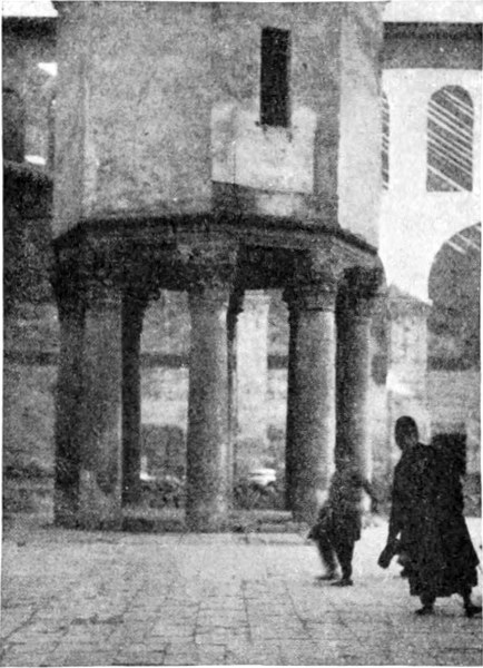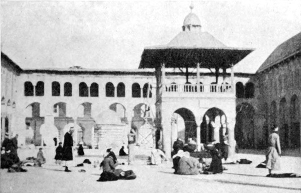 Nach kurzem Fragen fand ich die Wohnung Habīb Fāris'. Ich wurde freundlich aufgenommen; Habīb war ausgegangen, Namrūd auswärts (verließ mich mein guter Stern?), aber wollte ich nicht herein[S. 19]kommen und ausruhen? Das Haus war klein und voller Kinder, und noch erwog ich bei mir die Frage, ob nicht der feuchte Erdboden draußen eine bessere Ruhestatt darbieten möchte, als plötzlich ein schöner, alter, ganz arabisch gekleideter Mann erschien mit der Erklärung, daß er und kein anderer mich beherbergen würde, mein Pferd am Zügel nahm und mich mit sich führte. Das Tier wurde in der Karawanserei eingestellt, ich stieg eine hohe, schlüpfrige Treppe hinauf und betrat einen steingepflasterten Hof. Jūsef Effendi eilte voraus und öffnete die Tür seines Gastzimmers. Fußboden und Diwan waren mit dicken Teppichen belegt, die Fenster blitzten, wenn sie auch viele zerbrochene Scheiben aufwiesen, eine europäische Chiffonniere stand an der Wand: ich sah mich in meinen Erwartungen weit übertroffen. Einen Augenblick später war ich ganz heimisch, trank Jūsefs Kaffee und aß meinen eignen Kuchen dazu.