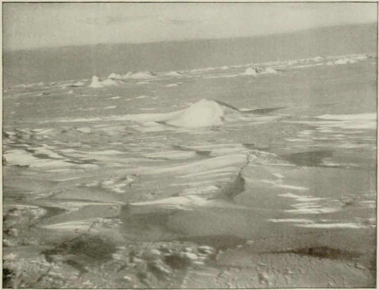 From the month of December, 1898, up to March, 1899, easterly winds were predominating, and these caused a very considerable drifting of the ice. In the course of these three months we drifted in this way from about 87° longitude west of Greenwich as far as to 103°, or a distance of about 950 kilometres (this distance is calculated in a straight line on the seventy-first parallel circle). That this easterly wind, which prevailed for such a length of time and mostly with great violence, was no local wind, we can safely assume. Its place of origin was no doubt the regions around Grahamland and Alexander Islands. This gives me further cause to believe that the sea along the western coast of these countries was perfectly navigable during the months of February and March, 1899. But there is no reason whatever to suppose that this is the case every year. On the contrary, previous expeditions have always found this part of the antarctic drift-ice completely closed. We, on board of the Belgica in February, 1898, also found within the drift-ice along these countries absolutely no navigable water. If a future expedition were to choose the same region where the Belgica did its work for a field of investigation, my unqualified advice to it would be to linger for some time near the coast of these countries, awaiting a separation of the ice from the land. What a great advantage there would be in navigating alongshore! Possibly harbours might be discovered, stations built, and depots established, and one would then always have something to depend on. During our drift in the ice we never dared venture on foot so far out as to lose sight of our ship. It would be wholly different if there were regular stations from which to start the work. We could[452] then safely proceed southward with a sleigh-boat and possibly accomplish fine results, for the antarctic ice, compared to the arctic ice which I have had a chance to observe, is much more level and even, and consequently easier to traverse.