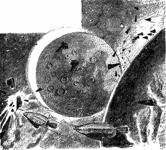 Then around us the air flashed brilliant with green ray and bursting flares, as de-cohesion rays and etheric bombs crashed and burst from ship to ship. Weaponless our cruiser hung there, at the center of that gigantic battle, while around us the mighty cruisers of the Galaxy and the long black cones of the tentacle-people crashed and whirled and flared, swooping and dipping and racing upon each other, whirling down to the glowing world below in scores of shattered wrecks, vanishing in silent flares of blinding light. From far away across the surface of the luminous world beneath, the great swarms of cones drove on toward the battle, from the shining towers of cities far away, racing fearlessly to the attack, sinking and falling and crumbling beneath the terrible rays of the leaping ships above, ramming and crashing with them to the ground in sacrificial plunges. But swiftly, now, the cones were vanishing beneath the brilliant rays.