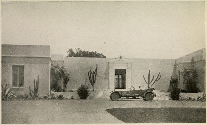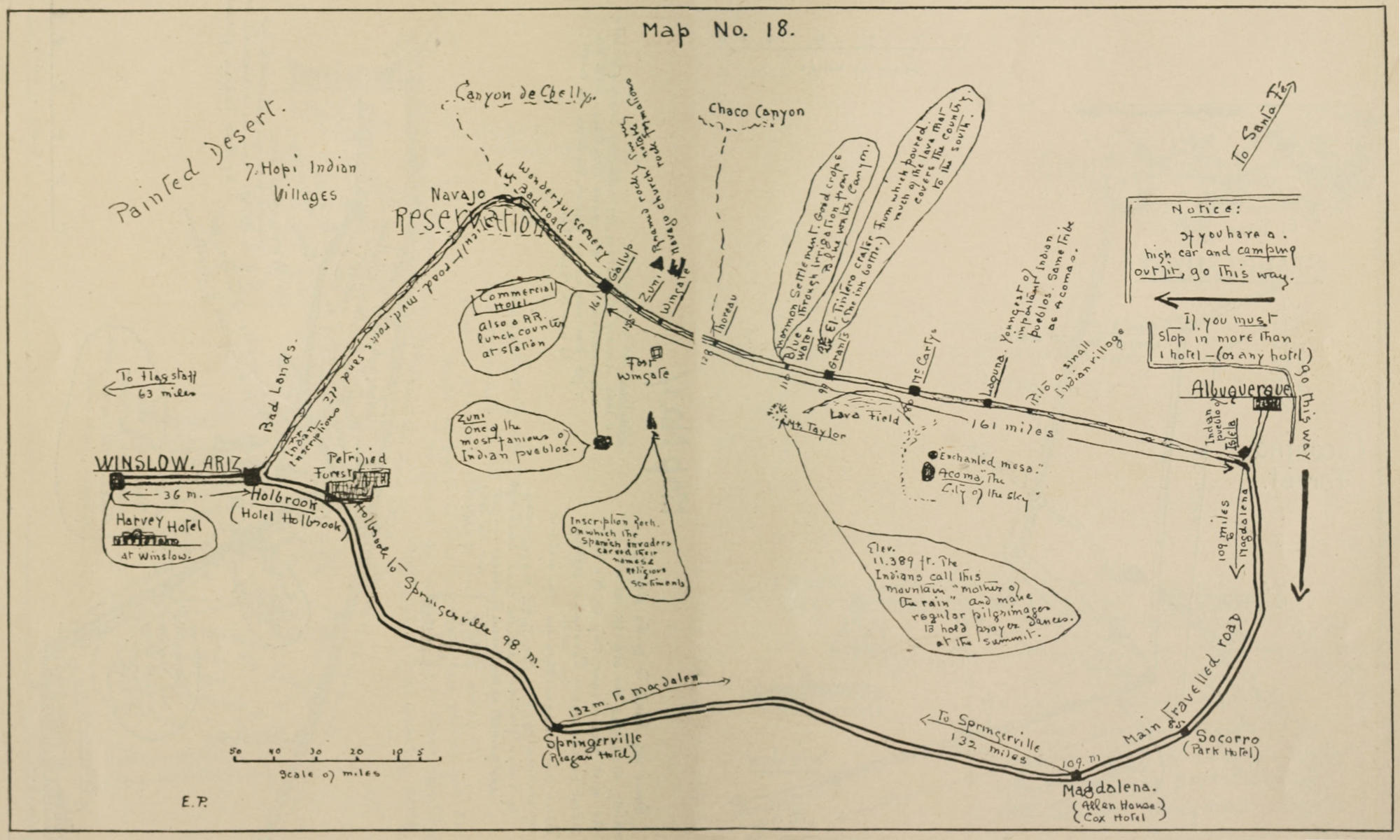 Interpreting “comfort” as really meaning “luxury,” you can go, so far as roads are concerned, only to Pueblo. So far as high-class hotels are concerned, there are two inhospitable distances. The first from Omaha, Nebraska, to Cheyenne, Wyoming; the second between Albuquerque, New Mexico, and Winslow, Arizona, over three hundred miles.[7] Between Ash Fork, Arizona, and Needles, California, the distance is one hundred and ninety-one miles, which over those roads is a long distance, but perfectly possible to make in a day. Also it is by no means necessary to motor across any of these sections, unless you choose to. Putting a machine on a freight train is a very different matter from putting it on a boat and shipping it to Europe. In the latter case, you have to have a crate made as big and clumsy as a small house; then there are always delays and complications about catching boats, and altogether it is something of an ordeal. But to send a motor across[279] our own country, for as short or as long a distance as you please, is very simple. You have only to drive it to the railroad station, roll it on an automobile freight car with a door at the end, as in a small garage, take the next passenger train yourself and skip as many or as few miles as you choose. In America, automobile freight is wonderfully efficient, and is about as fast as ordinary express. (At least the Santa Fé service is.)