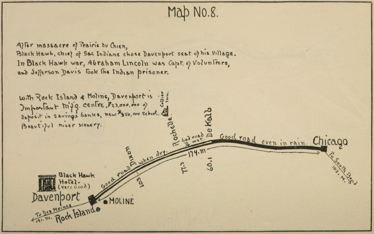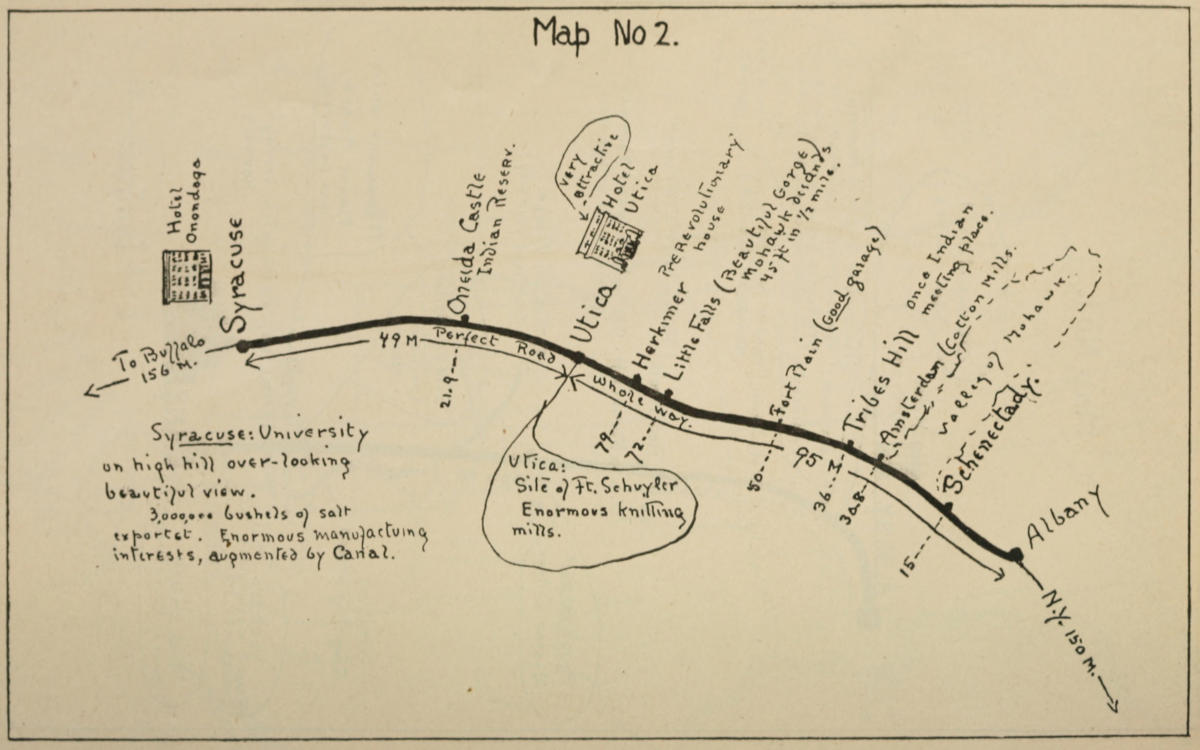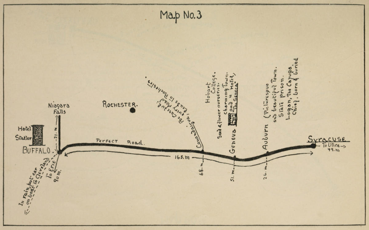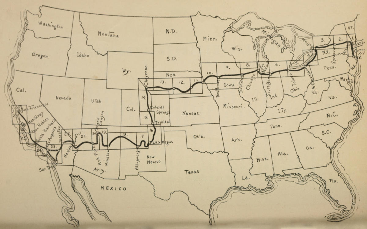 We had driven across Europe again and again. In fact I had in 1898 gone from the Baltic to the Adriatic in one of the few first motor-cars ever sold to a private individual. We knew European scenery, roads, stopping-places, by heart. We had been to all the resorts that were famous, and a few that were infamous, but our own land, except for the few chapter headings that might be read from the windows of a Pullman train, was an unopened book—one that we also found difficulty in opening. The idea of going occurred to us on Tuesday and on Saturday we were to start, yet we had no information on the most important question of all—which route was the best to take. And we had no idea how to find out!