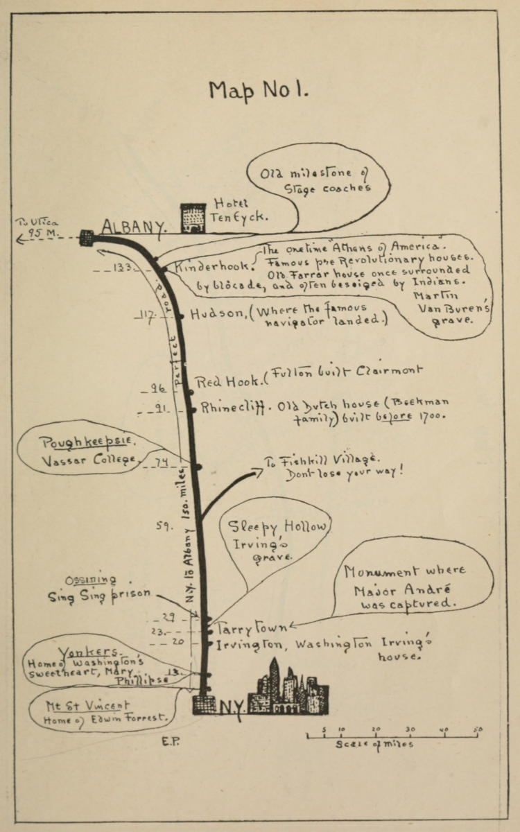 At that everyone interrupted at once. One thought we were insane to attempt such a trip; another that it was a “corking” thing to do. The majority looked upon our undertaking with typical New York apathy. “Why do anything so dreary?” If we wanted to see the expositions, then let us take the fastest train, with plenty of[2] books so as to read through as much of the way as possible. Only one, Mr. B., was enthusiastic enough to wish he was going with us. Evidently, though, he thought it a daring adventure, for he suggested an equipment for us that sounded like a relief expedition: a block and tackle, a revolver, a pickaxe and shovel, tinned food—he forgot nothing but the pemmican! However, someone else thought of hardtack, after which a chorus of voices proposed that we stay quietly at home!