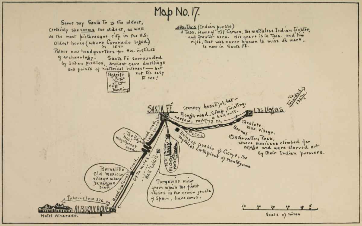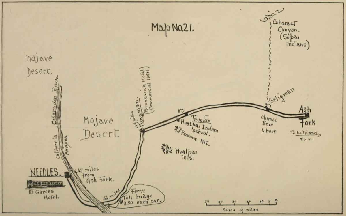 We spent only two days at the Grand Canyon and the car arrived in Los Angeles at the same time we did. There is only one deterrent to frequent freight shipments: the cost. Automobiles weigh a good deal and the freight charges are by the pound. From Winslow, Arizona, to Los Angeles—a distance of 613 miles—costs $151.20 for a car weighing 4,000 pounds. A 2,000-pound car would cost, of course, exactly half that amount. If you don’t want to go into the desert where hotels are great distances apart and roads are not the smoothest in the world, a 3,000-pound car costs $133.20 from Albuquerque, New Mexico, to Barstow, California, after which there are plenty of good hotels and beautiful California roads. The above freight rates will be of interest to very few, as except in case of accident or some unseen conditions no one who can help it, will want to see their car, housed like a lonesome and abandoned dog, on a freight. If it is a very crippled car, that is different; it is more like leaving it in a nice cot in a hospital, where it can’t get hurt any more.