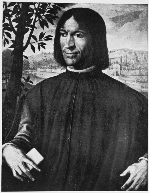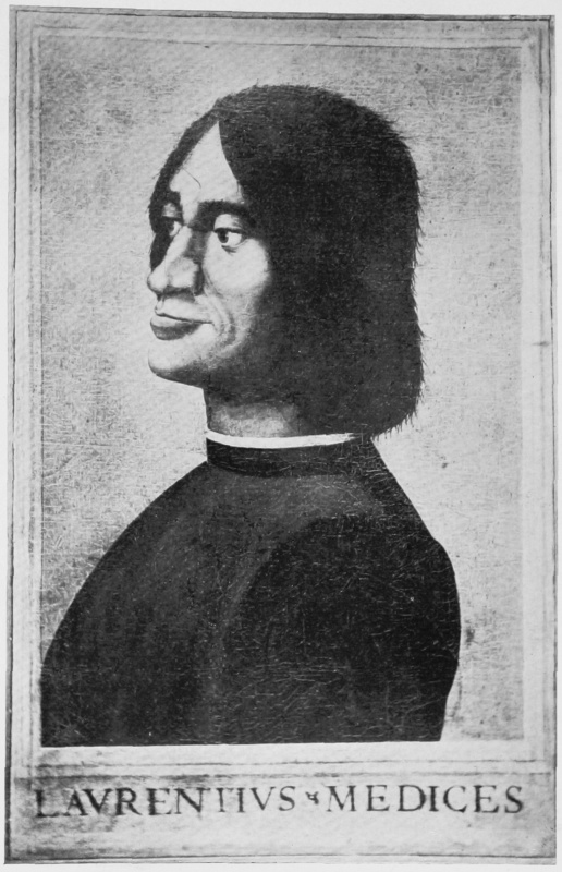 My best thanks are due to Cavaliere Angelo Bruschi, librarian of the Marucelliana Library in Florence, without whose valid assistance and advice I should have had great difficulty in collecting the letters; to Dr. Dorini of the Florentine Archives, whose aid was invaluable in helping me to decipher the almost illegible manuscripts; and to Signor Gugliemo Volpi, several of whose pamphlets and articles are quoted. I must also thank the Baroness Mollinary of Como for so kindly having photographed for me her most interesting early portrait of Lorenzo the Magnificent, never before published; and Dr. Giovanni Poggi, director of the Bargello in Florence, for giving me the photograph of Lorenzo’s portrait at Poggio a Caiano. The Baroness Mollinary’s picture is one of the many that belonged to her ancestor Paolo Giovio, and bears a strong resemblance to the fine miniature of Lorenzo, the property of M. Prosper Villon, reproduced in Le Musée de Portraits de Paul Jove by M. Eugène Muntz, in which, however, Lorenzo looks rather older. Both show the same humorous, kindly face, with a strong mouth, determined jaw, and fine eyes. In the miniature the head and shoulders are against and under a baldaquin, on each side of which is a small bit of landscape. Below is inscribed Laur M P P and the Medici arms (with six balls), surmounted by Lorenzo’s device, three ostrich feathers, white, green, and red (faith, hope, and charity), while a floating ribbon behind bears his motto Semper. The portrait at Poggio[Pg viii] a Caiano is perhaps by Alessandro Allori, therefore of course not contemporary; it may be a copy of an older and lost picture. I must also express my great gratitude to the Rev. Principal Lindsay of Glasgow for kind help and criticism during the progress of my work.