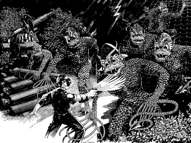 Even as he lodged this peril, Gates recognized the huge gray-green lips of Red-Hood. He saw the malevolent red light in the eyes of his chief antagonist; and, like a matador fleeing a bull, he ducked and ran sideways. Then, with ferocious suddenness, he turned and swung the flashing blade upward.