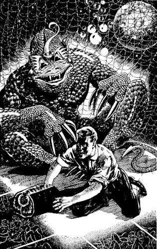 As if this discovery in itself was not ghastly enough, a still more terrible sight presented itself. Scores of beings, vaguely human-shaped and each with many limbs dangling octopus-like, swung agilely along the gigantic webs. Of prodigious size—seemingly not less than fifteen or twenty feet tall—the creatures were of a watery pallor that made only the bare outlines of their forms visible. Each, in the middle of an egg-shaped head, displayed two oddly three-cornered eyes that glowed with dull red flames; each possessed six or eight many-fingered hands with which it was adding new segments to the monstrous web.