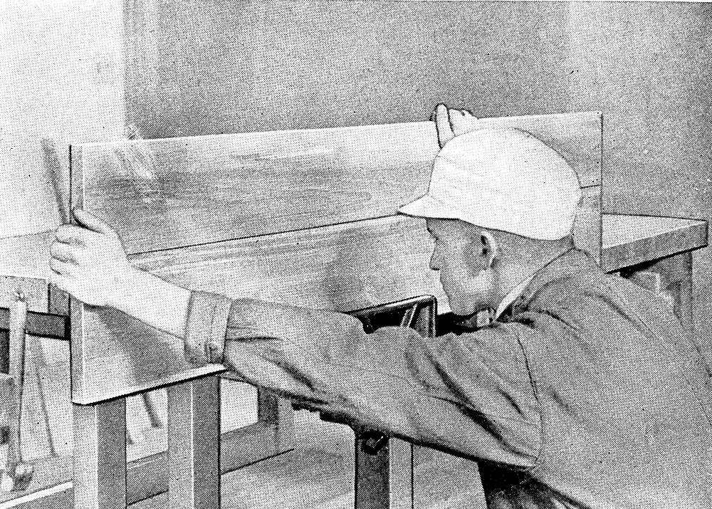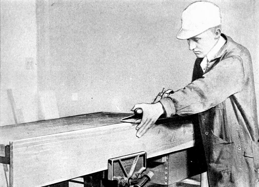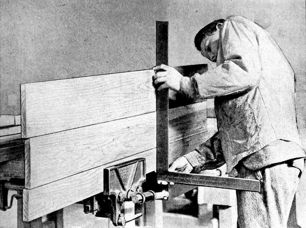 Plane one edge of each side and end perfectly straight and square with the surfaces. Check these for “working edges.” Measure over 18” and with a straight-edge, mark the width on each. Plane carefully to this line, keeping the edges square across.