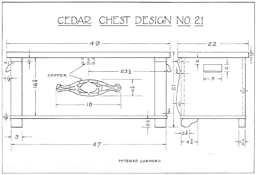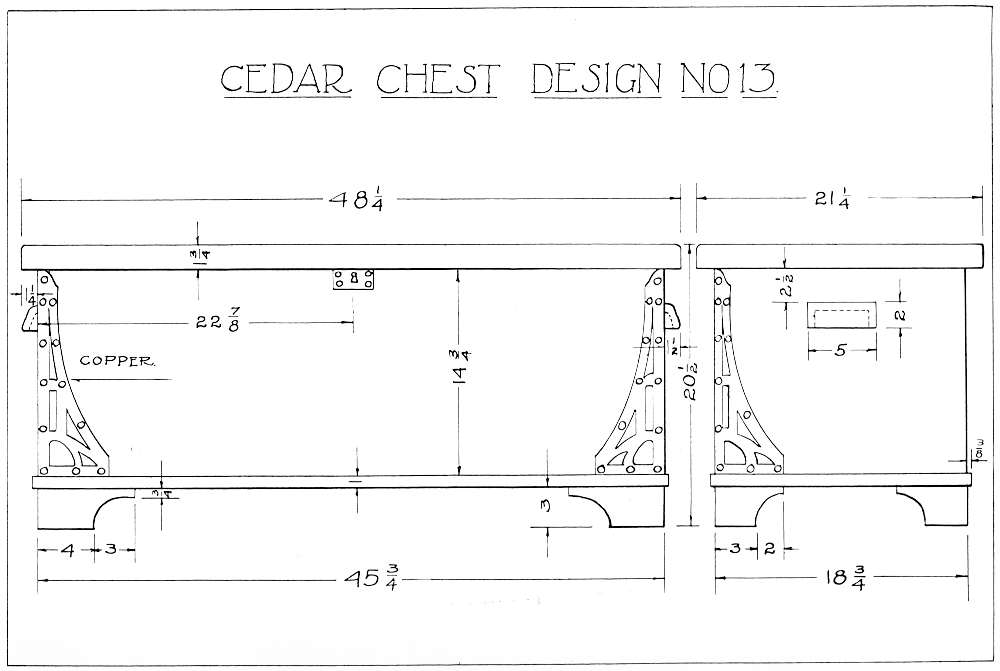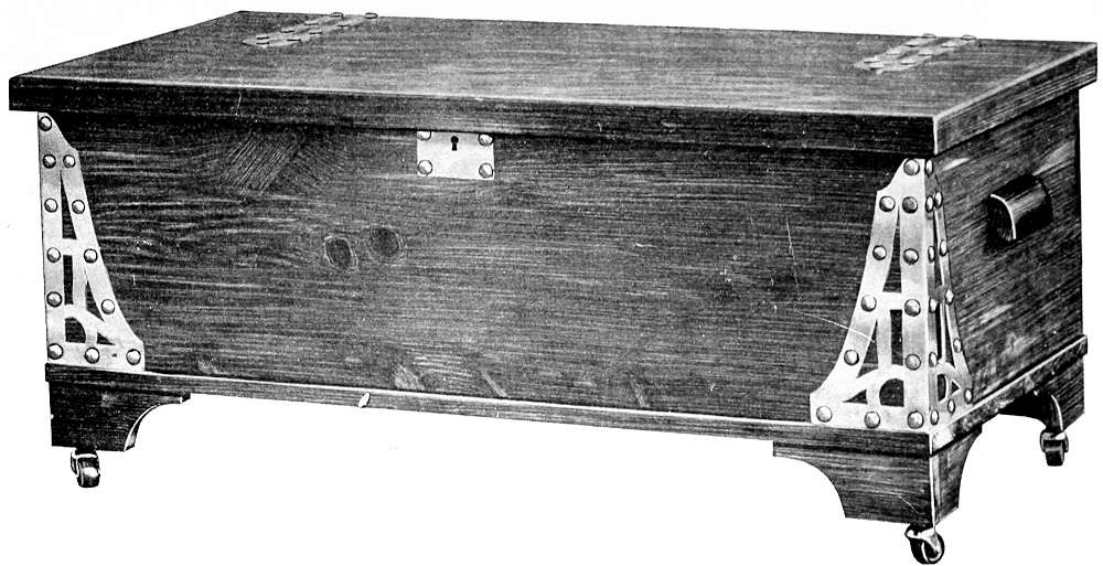 After the finish on the chest has thoroughly dried, any copper trimmings desired can be applied, providing, of course, that the appearance of the chest will be improved by them. If good joints have been obtained on the corners, copper corners will help but little, but if the joints are open, well-designed corners will cover up the defects without detracting from the appearance of the chest. As a rule, handles of cedar, well executed, look better than metal pulls attached to the ends of the box, but if metal corners are employed the pulls should also be of the same. If a lock is attached, it will need an escutcheon, and hinge plates on the cover go well where the other metal trimmings are adapted.