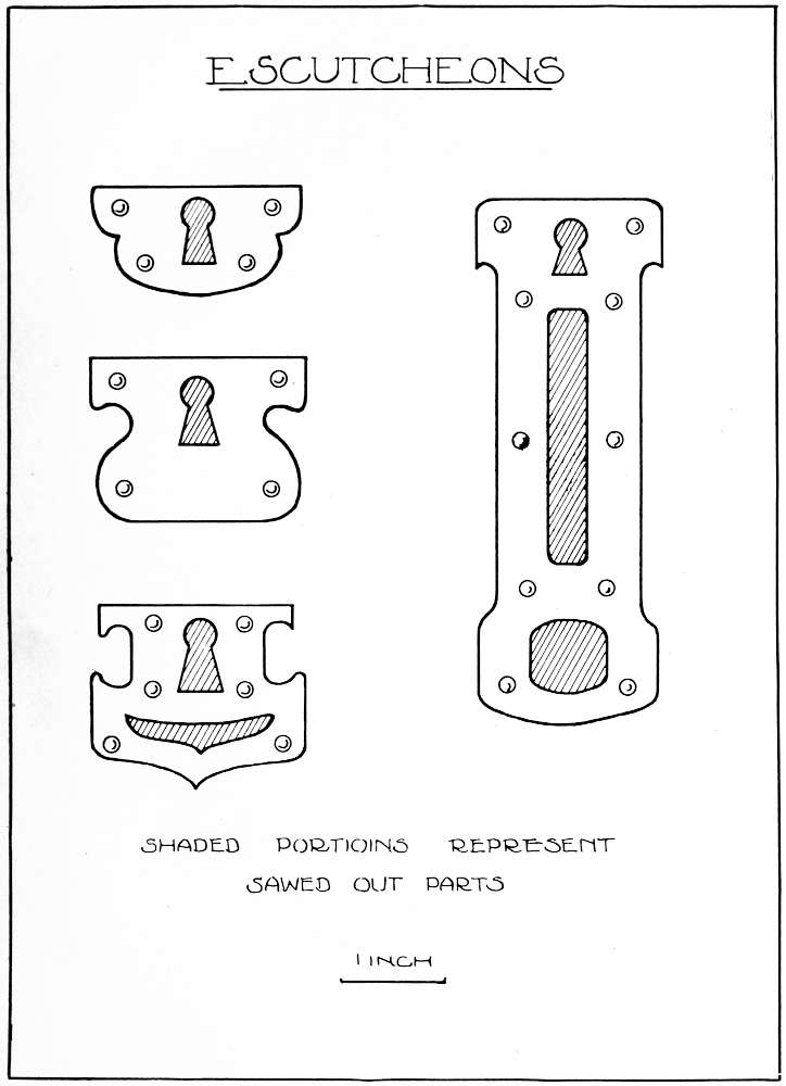 The escutcheon can be small and plain, or rather long and fancy. Fig. 67 illustrates both kinds. The design should be symmetrical about the vertical center line. The key hole size is dependent upon the size of the key furnished with the lock, and its distance from the upper edge is governed by the depth of the key hole in the lock.