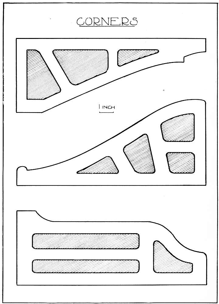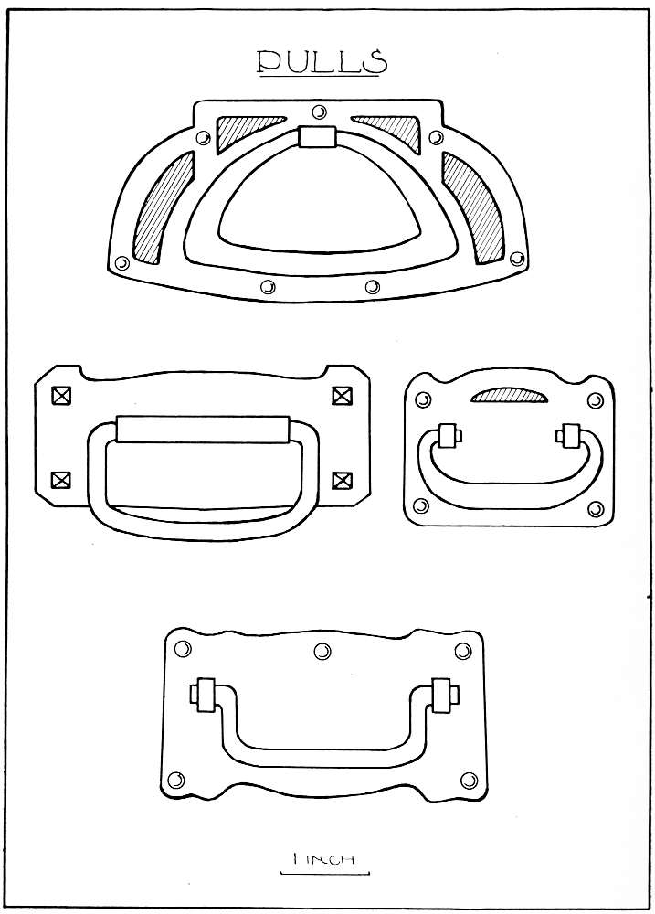 The design should be first worked out on paper, and transferred to the metal by using carbon paper. Care should be exercised with the designing. A poor design looks worse than no design at all—copper bands with straight edges certainly give a pleasing appearance, as Fig. 29 shows. The student will do well to co-operate with the art teacher when designing his trimmings. The illustrations in this chapter offer suggestions for design, Fig. 67 showing escutcheons, Fig. 68 pulls, Fig. 69 hinge plates, and Fig. 70 corners. Although these designs do not emphasize it, the same motif should be used in every case. For example, straight bands across the top should not be used with fancy-sawed corners. A reasonably plain hinge plate will not look well on a chest with very elaborate pulls and corners. Care should be given this designing that the different parts do not show incongruity.