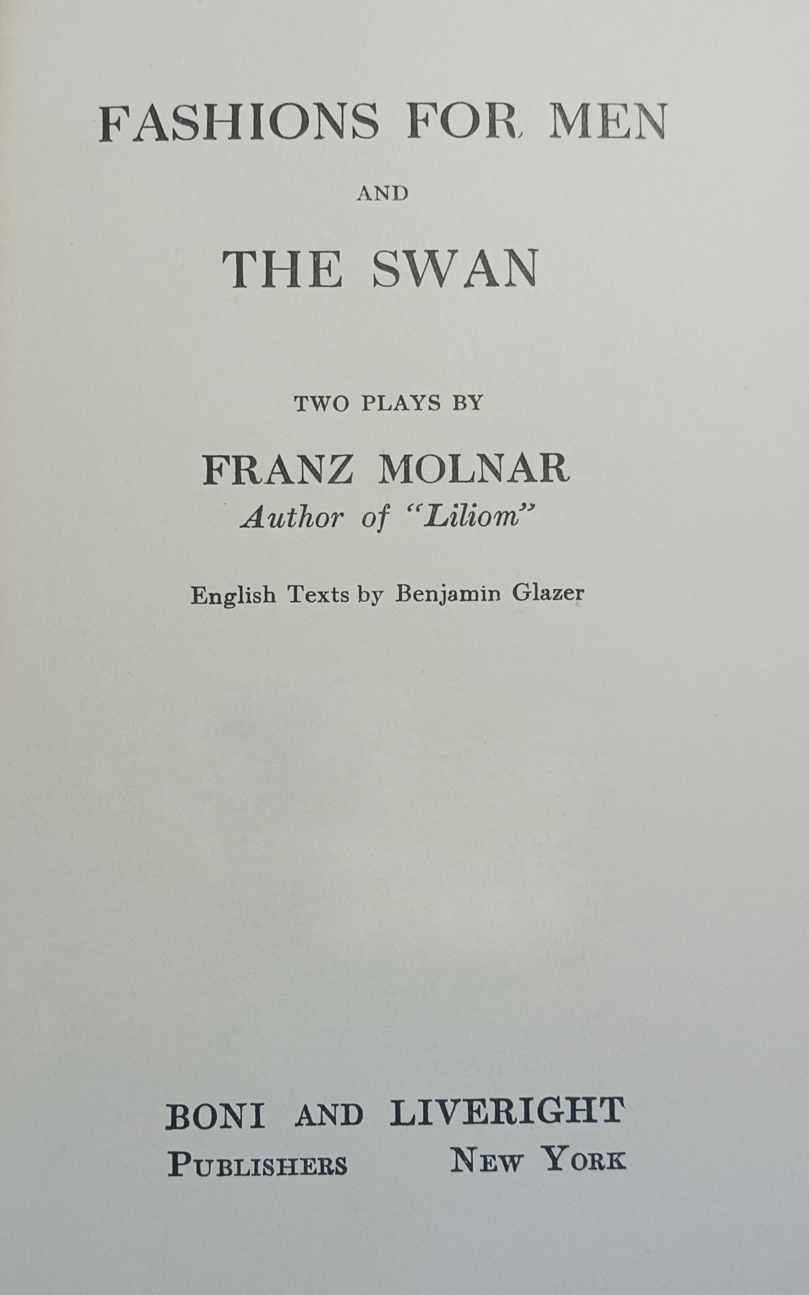 CAUTION—All persons are hereby warned that the plays published in this volume are fully protected under the copyright laws of the United States and all foreign countries, and are subject to royalty, and anyone presenting any of said plays without the consent of the Author or his recognized agents, will be liable to the penalties by law provided. Applications for the acting rights of “Fashions for Men” must be made to the Modern Theatre Corporation, 17 East 45th Street, New York City.