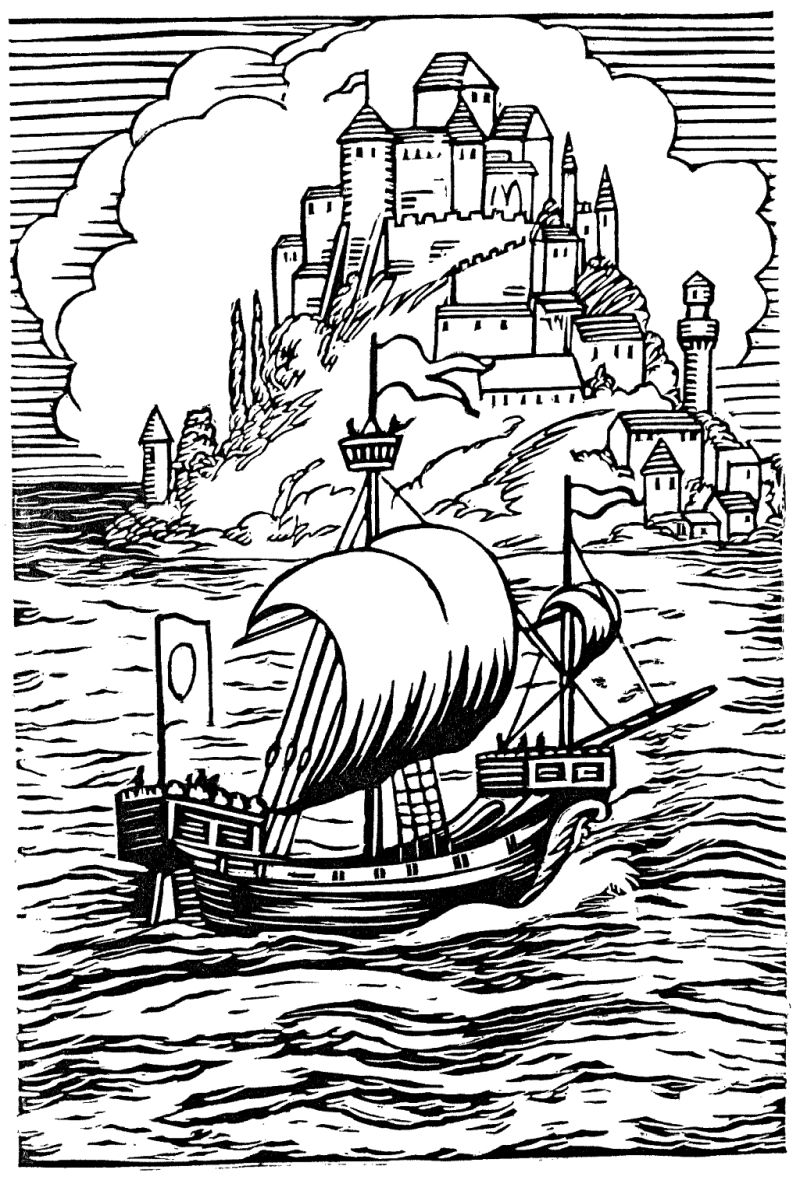 But what a poster an artist can make of her! No artist, however gifted, could do that with a publisher’s contract or a mortgage. So a ship, after all, whatever nautical and engineering science may do with her, aided by the tastes and habits of millionaires, and the rules and regulations of many committees of exacting experts, must be a symbol which still suggests to men in bondage an undiscovered [Pg 35]golden shore, or fleece, of which they will continue to dream, as they dream irrationally of peace while never ceasing to fashion war.
