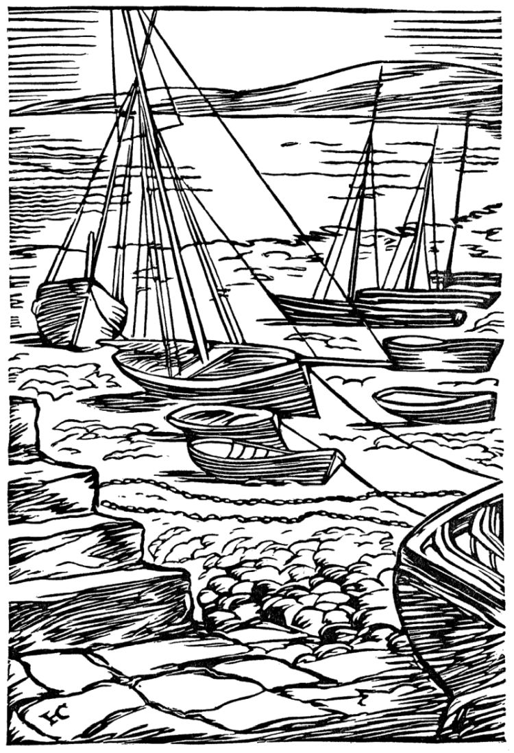 I don’t know what he wanted to happen there. It gives me enough to think about. I always feel [Pg 228]that plenty is happening to me as I watch those open boats. When a Greek vase is the equal of one of them in grace it is the treasure of a national museum. But our men can build such craft in their spare hours. The human mind, confused still and thick with the dregs of the original mud, has clarified itself to that extent. It would not be easy to prove that man has made anything more beautiful than one of our boats. Its lines are as delicate and taut as a dove’s. It is quick and strong, and it is so poised that it will change, when going about, as though taken by a sudden temerarious thought; and then in confidence it will lift and undulate on a new flight. The balance and proportions of its body accord with all one desires greatly to express, but cannot. In that it is something like music. The deep satisfaction to be got from watching a huddle of these common craft, vivacious but with wings folded, and tethered by their heads to the landing-stairs, each as though eagerly looking for the man it knows, will send me to sleep in a profound assurance that all is well. For they seem proper in that world beyond my window, where there is the light and space of freedom. The tide is bright with its own virtue. The range of sandhills across the Estuary is not land, nothing that could be called soil, but is a promise, faint but [Pg 229]golden, far in the future. You know that some day you will land there. But there is plenty of time for that. There is no need to hurry. It is certain the promise is for you. One may sleep.