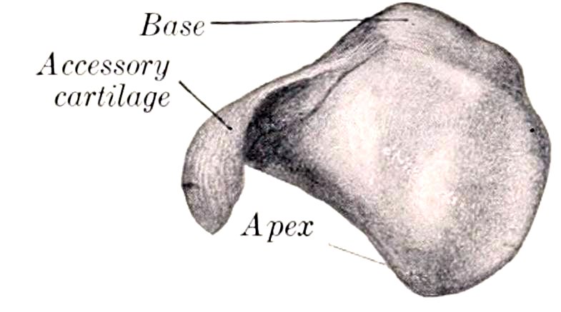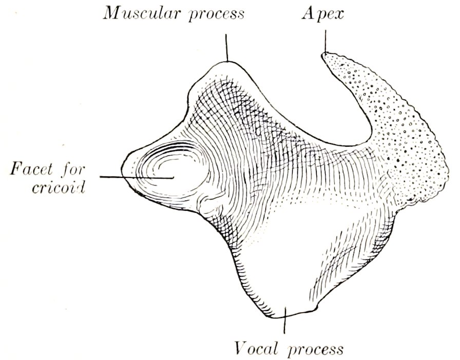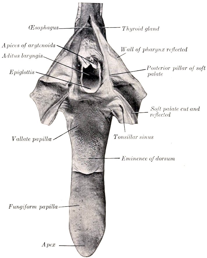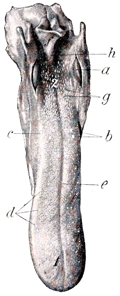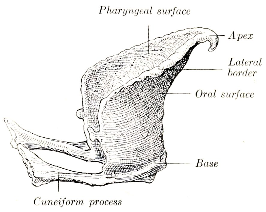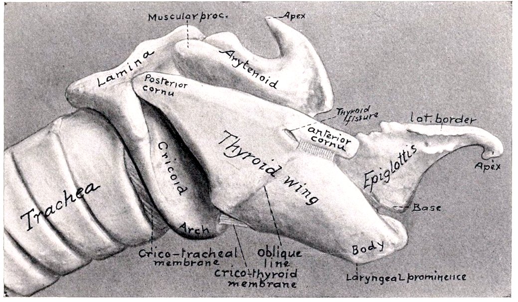 134. The arrangement here is one of the most striking features of the pig’s larynx. The short, thick middle hyo-epiglottic ligament and the anterior part of the thyro-hyoid membrane are inelastic, while the posterior part of the membrane is thin and elastic and allows the epiglottis to be separated by a considerable interval from the thyroid cartilage. Moreover, the borders of the epiglottis are connected with the thyroid cornua of the hyoid bone by lateral hyo-epiglottic ligaments.