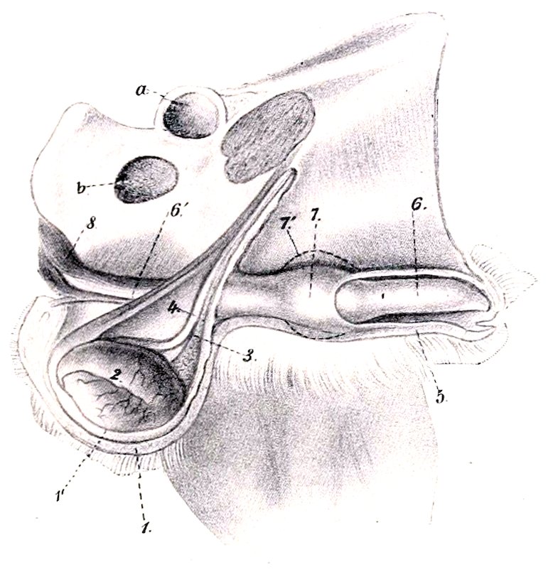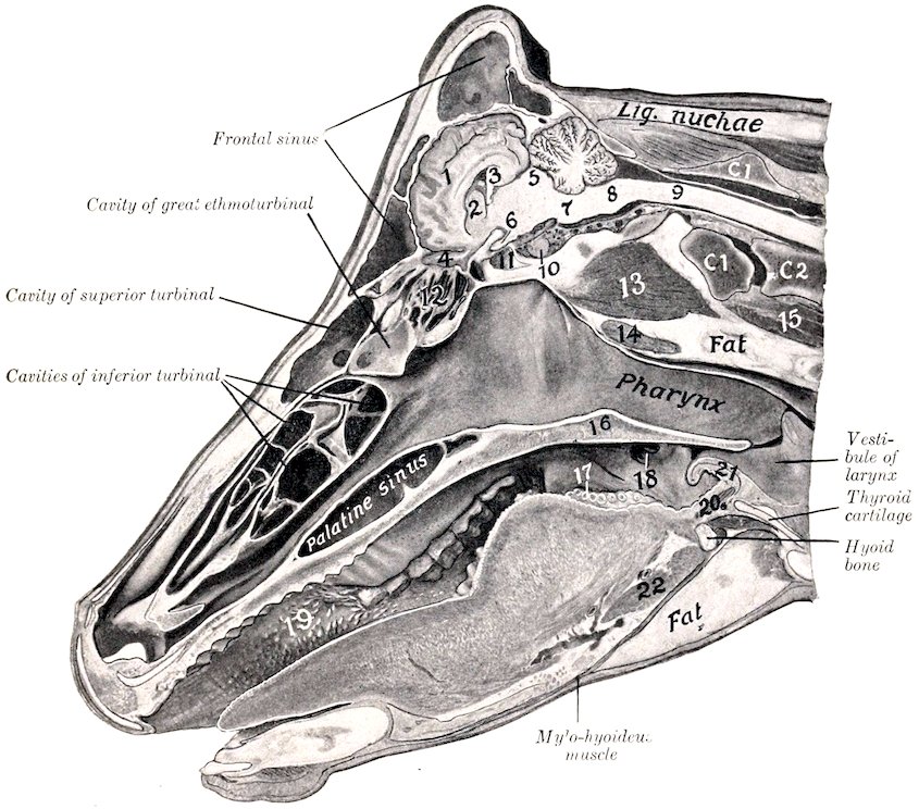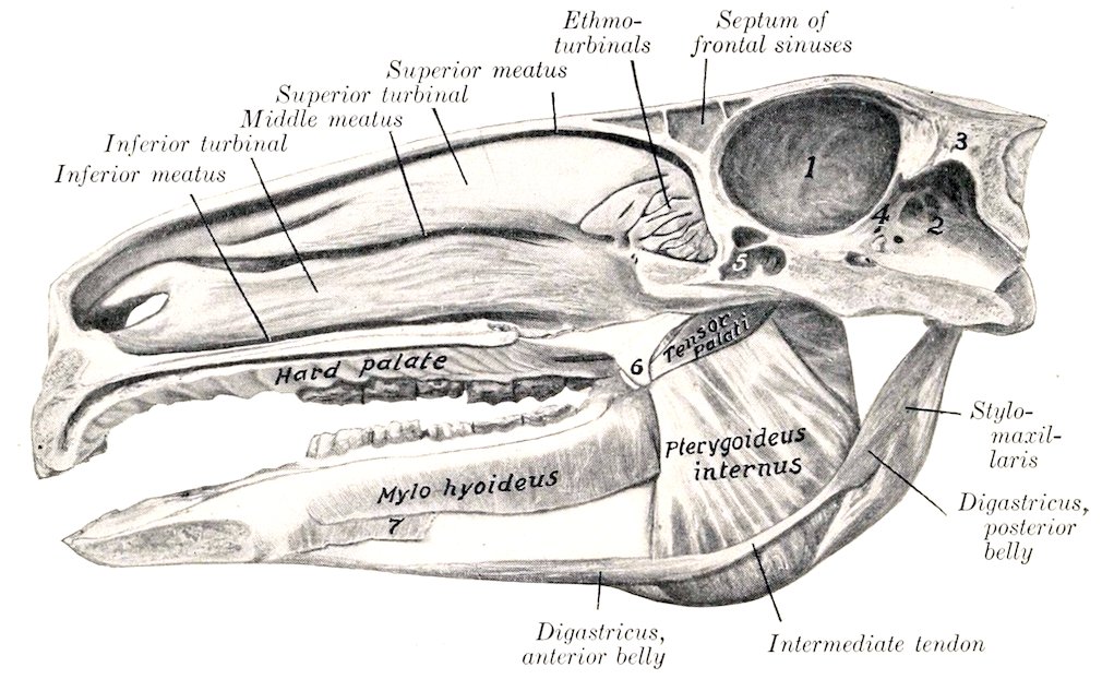 222. There is, strictly speaking, no osseous part of the tube such as occurs in man. In the horse the cartilage extends to the tympanic orifice.