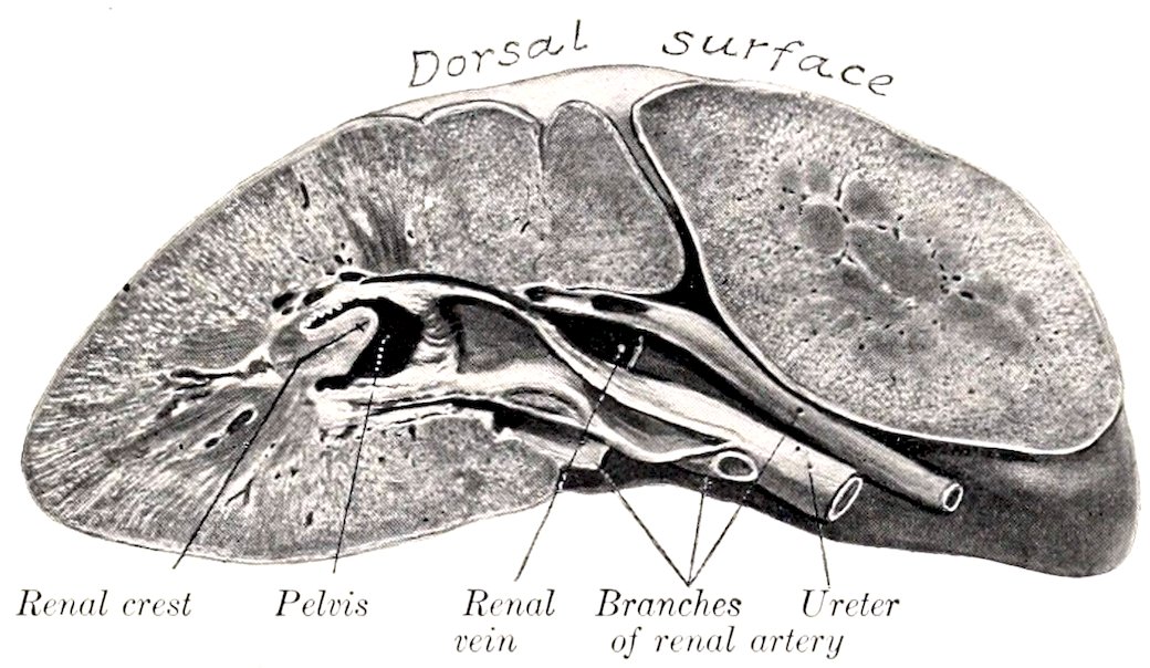 137. The fœtal kidney is divided by furrows into a number of polygonal areas, each of which is the base of a pyramidal lobe or renculus. These furrows usually disappear before or soon after birth in the foal, although traces of them are sometimes seen in the adult.