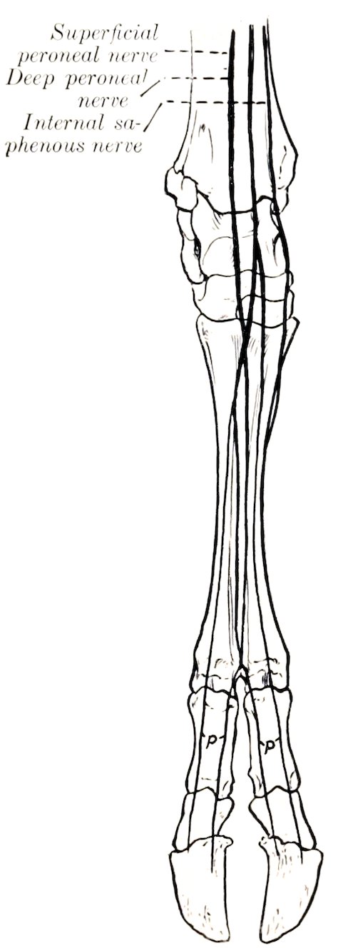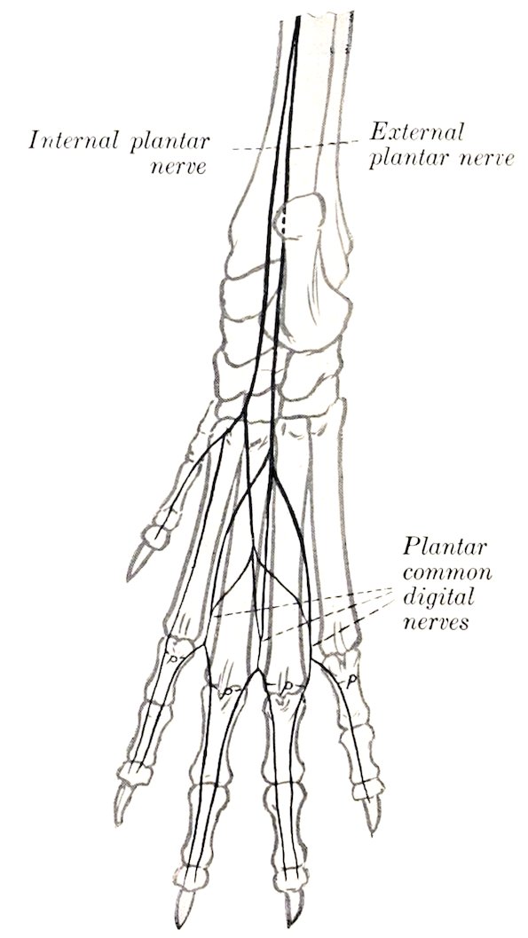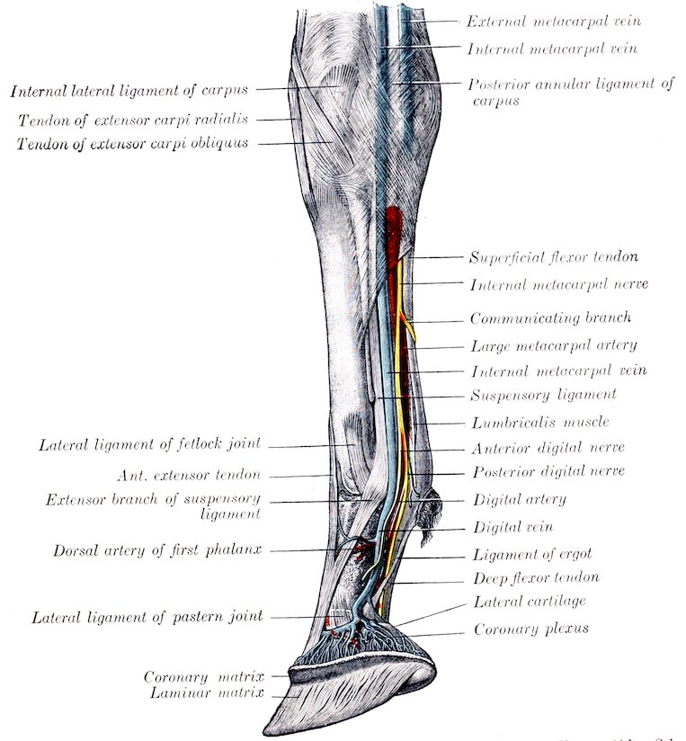 209. In veterinary works these are frequently termed plantar nerves, which is an unfortunate misnomer. The writer inclines to the use of the old term metacarpal or common digital to designate the nerves as far as their divisions, and the term digital beyond this.