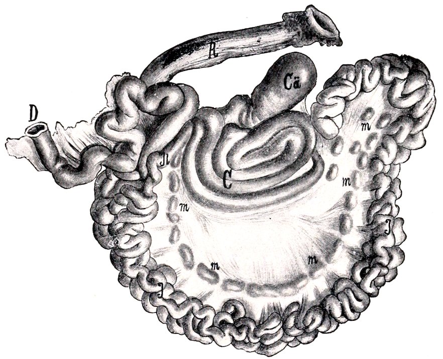 166. The left branch is a descriptive convention rather than a reality, since the arteries of the small intestines spring from the mesenteric trunk either directly or by short common stems with an adjacent vessel.