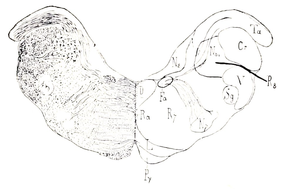 | 149 | arch; t, t′, superior ischiatic spine; n, acetabulum; v, epiphyseal line | arch; t, t′, superior ischiatic spine; u, acetabulum; v, epiphyseal line |