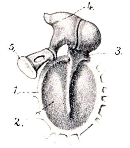 145. Sometimes one vesicula or both are very large in the gelding. The writer has seen four cases in the dissecting room, three of which were bilateral, the other unilateral. The vesicula resembled the urinary bladder in appearance and contained about a quart of thick, amber-colored secretion.