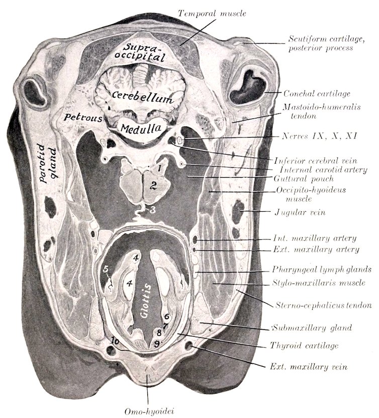 158. The relation to the guttural pouch is not constant. In some cases—especially when the head and neck are extended—the artery lies behind the pouch. The backward extension of the latter is variable.