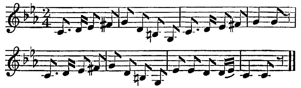 Two main causes have retarded the acceptance of this truth. First, the belief that national melody is entirely an affair of artifices and mannerisms, that it is constituted by special turns of phrase and figure—as though you could make a rose tree by tying roses to a Scotch fir, or turn “Rule Britannia” into a Hungarian tune by ending it with a Hungarian cadence. This, it may be said, simply misunderstands the nature of the law which it criticises. No doubt a certain range of expression belongs to each type of folksong. No doubt these accidents of figure and phrase appear upon the surface, and are often useful as [Pg 14] indications, but it makes all the difference whether they grow naturally in their place or lie there as mere lifeless appendages. Even the foreign idioms which a great composer may occasionally employ are only a graft let into the parent stock; the new growth is at once modified by the influence of the old, and alters its character to match its change of condition. And apart from these rare grafts the phrase of a true master will always be found conformable to the spirit that animates it, not because it constitutes the spirit, but because it emanates as property from essence. The second error springs from our loose and inaccurate methods of classification. That Mozart was an Italian composer seems now to be taken as an accredited jest; but it is more serious when we show our gratitude for the splendid work that Germany has done by scoring to her account all that has been accomplished by her neighbours. Schumann claims Chopin as a fellow-countryman; we are so far from protesting that we add Liszt, for whom “the great German master” was long a newspaper synonym, and even [Pg 15] hesitate about Smetana and Dvořák. It is true that classification is often extremely difficult—records are imperfect, names are misleading, histories are marred by want of ethnological knowledge; but the admission of ignorance is not a very strong basis for dogmatic denial. Critics who traverse a law, because they cannot see its applicability to the facts, would do well to make sure at the outset that the facts have been correctly observed.