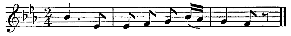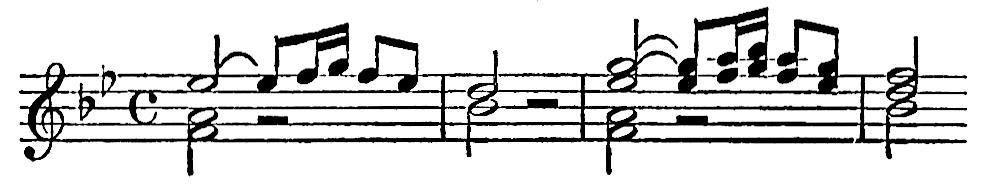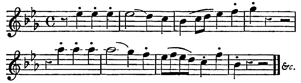 (3) There are several cases in which, without direct adaptation, Haydn has shown the same tendency of thought or phrase as the Slavonic folksongs. A favourite “curve” of his may be illustrated by the opening of the B♭ Symphony (Salomon, No. 9)—