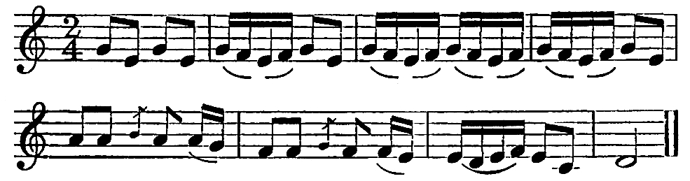 (4) These latter examples do not imply reminiscences, but at most a general sympathy of temper. A good deal more, however, is involved in the treatment of Slavonic dance tunes. It is hardly too much to say that what the Csardas was to Liszt the Kolo was to Haydn; with this difference—that the earlier and greater musician has throughout made a finer use of his materials. The Kolo is a Slavonic measure, which I have seen the children dance at Agram and the men at Sarajevo, bright [Pg 50] and cheery of movement, its tune in two-four time ingeniously varied by patterns of quaver and semiquaver figures. Here, for instance, is an example well known in Bosnia and Dalmatia:—