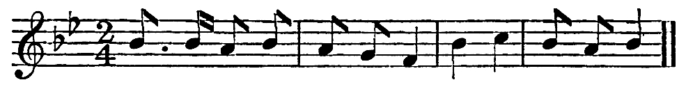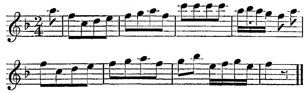 (5) In addition to the dance measure, Haydn has adopted other instrumental forms, e.g., marches, bag-pipe melodies, and the like. Here is one, with a strange rhythm, from the Pianoforte Scherzando in F major:— [Pg 56]