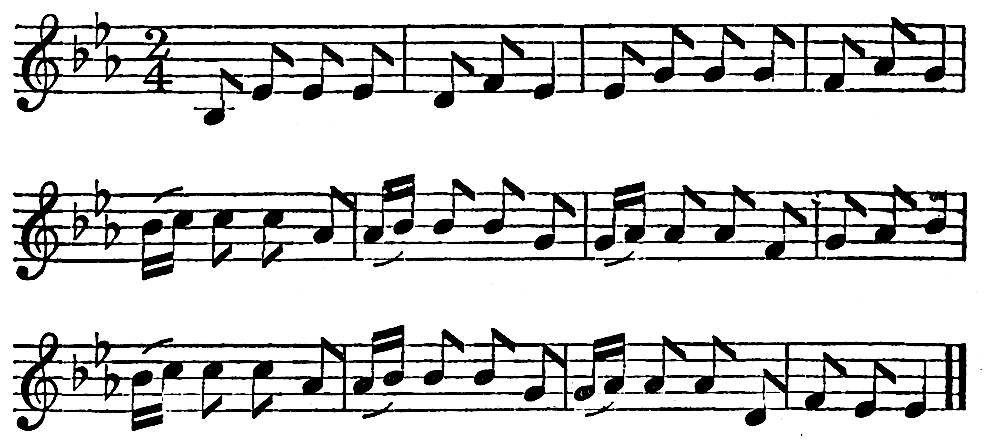 This is simply an amended version of the popular ballad, “Oj Jelena,” which belongs to the district of Kolnov, near Oedenburg, and is specially noted by Dr. Kuhač as being commonly sung [Pg 44] in Eisenstadt. Its tune, essentially Slavonic in rhythm and cadence, runs thus:—