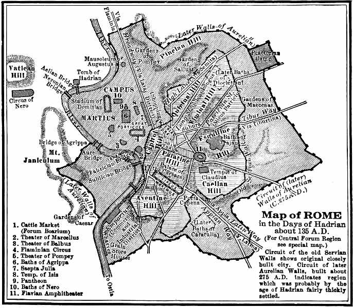 The year 134 after Christ has been chosen as the hypothetical time of this visit, not from any special virtue in that date, but because Rome was then architecturally nearly completed, the Empire seemed in its most prosperous state, although many of the old usages and traditions of the Republic still survived, and the evil days of decadence were as yet hardly visible in the background. The time of the absence of Hadrian from his capital was selected particularly, in order that interest could be concentrated upon the life and doings of the great city itself, and upon its vast populace of slaves, plebeians, and nobles, not upon the splendid despot and his court, matters too often the center for attention by students of the Roman past.