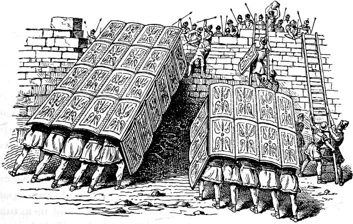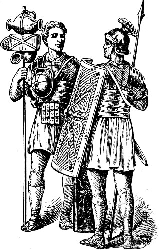 [170] Some legions were named for their organizers: Augustus, Claudius, etc.; some for real or alleged martial qualities, “Ferrata,” “Fulminata,” “Victrix,” and the like; one, the “Alauda,” from the lark’s wings worn on the helmets; several which were made by dividing existing legions were known as “Gemina,” and some from their place of original recruiting, “Gallica,” “Italica,” etc.