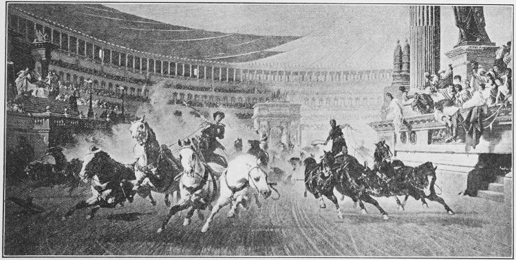 [209] The description of the Roman-style chariot race in Lew Wallace’s famous novel “Ben Hur” is technically as well as rhetorically admirable and accurate. However, no high-rank Roman, such as Messala is represented to have been, would have driven a quadriga in the public circus. The drivers were nearly always low-born men of provincial if not of servile origin.