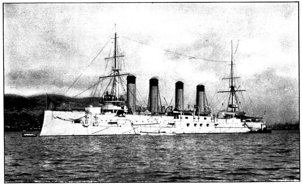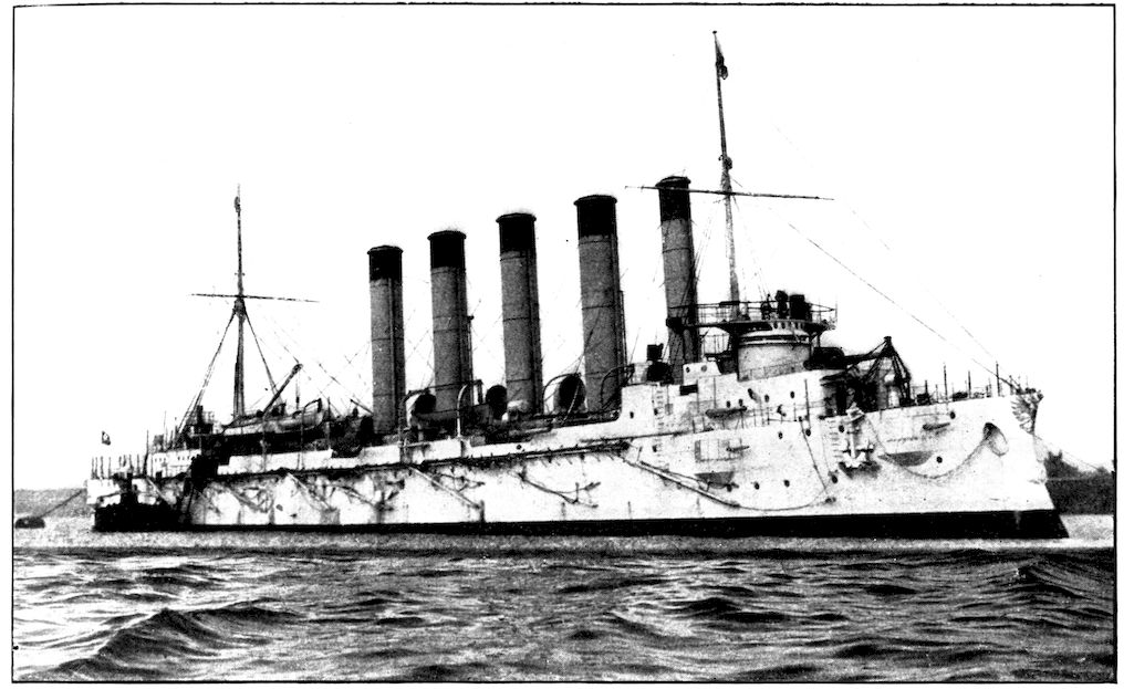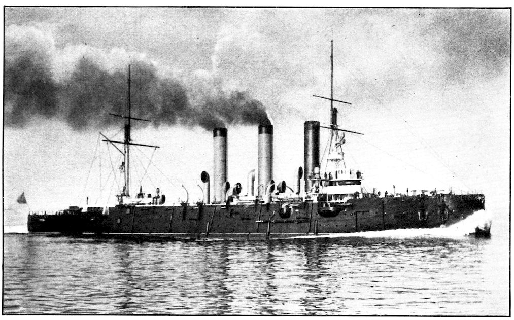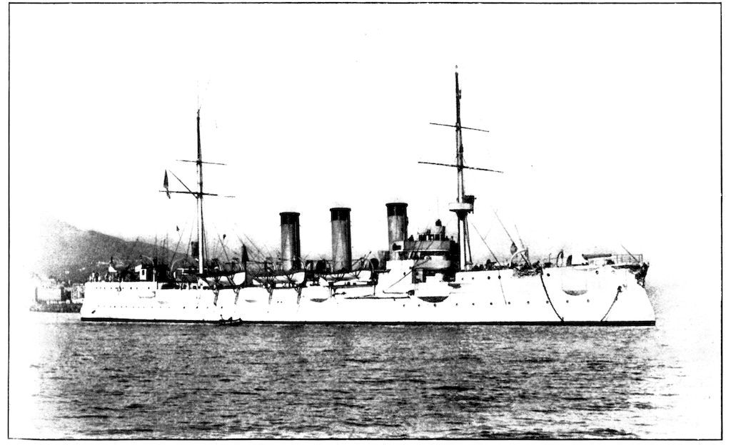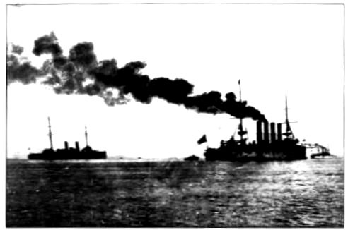 THE CRUISER “PALLADA,” WITH THE “POBIEDA” SHOWING JUST BEHIND HER